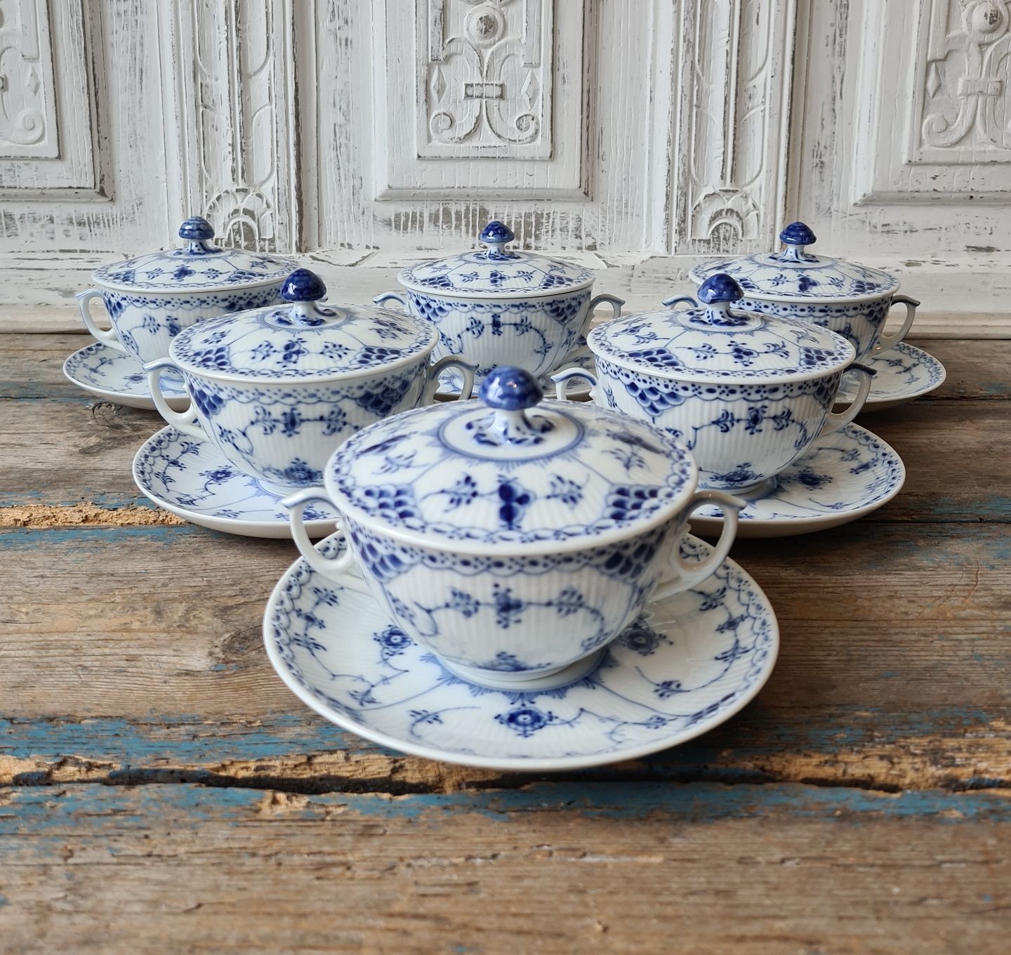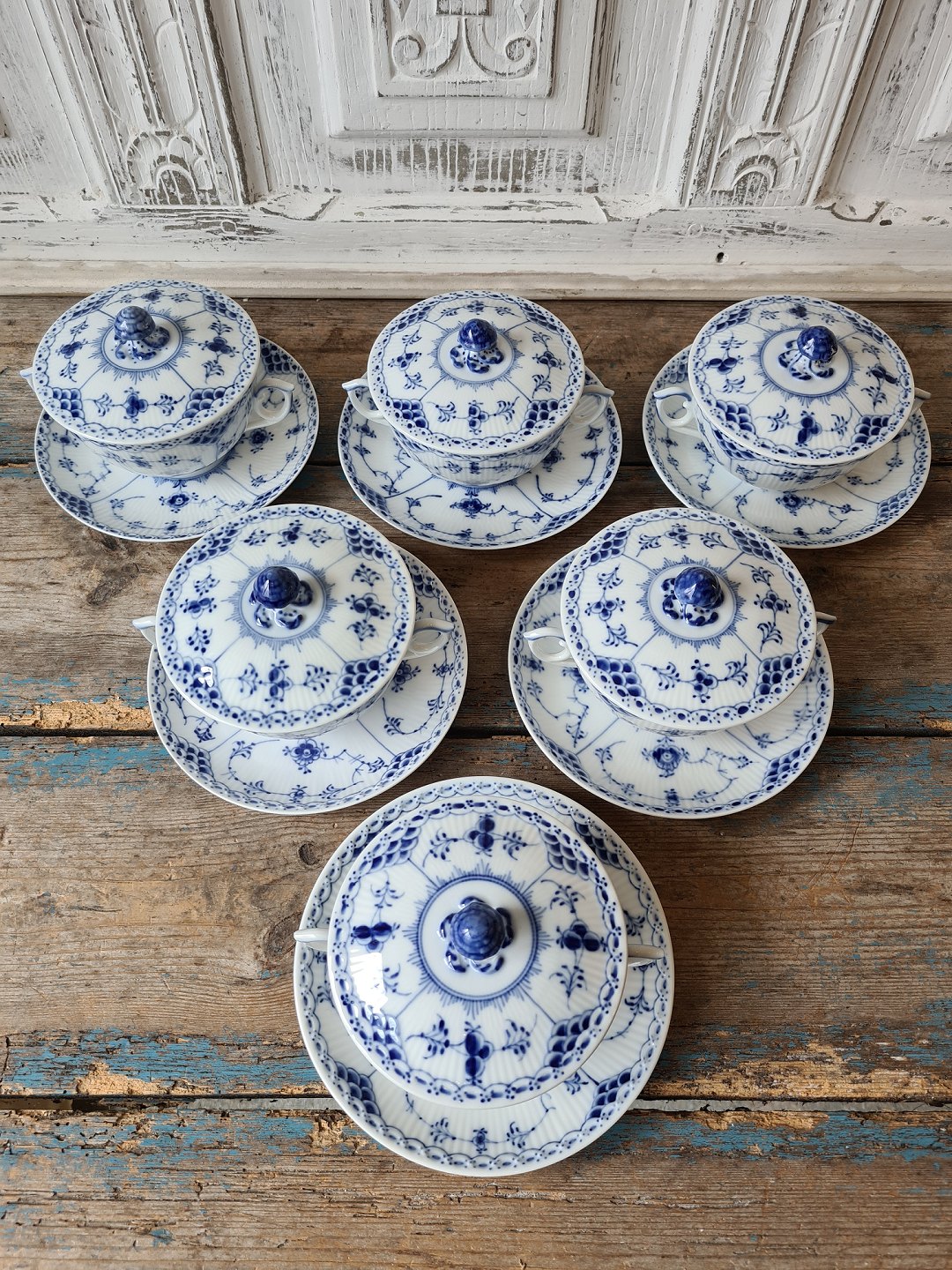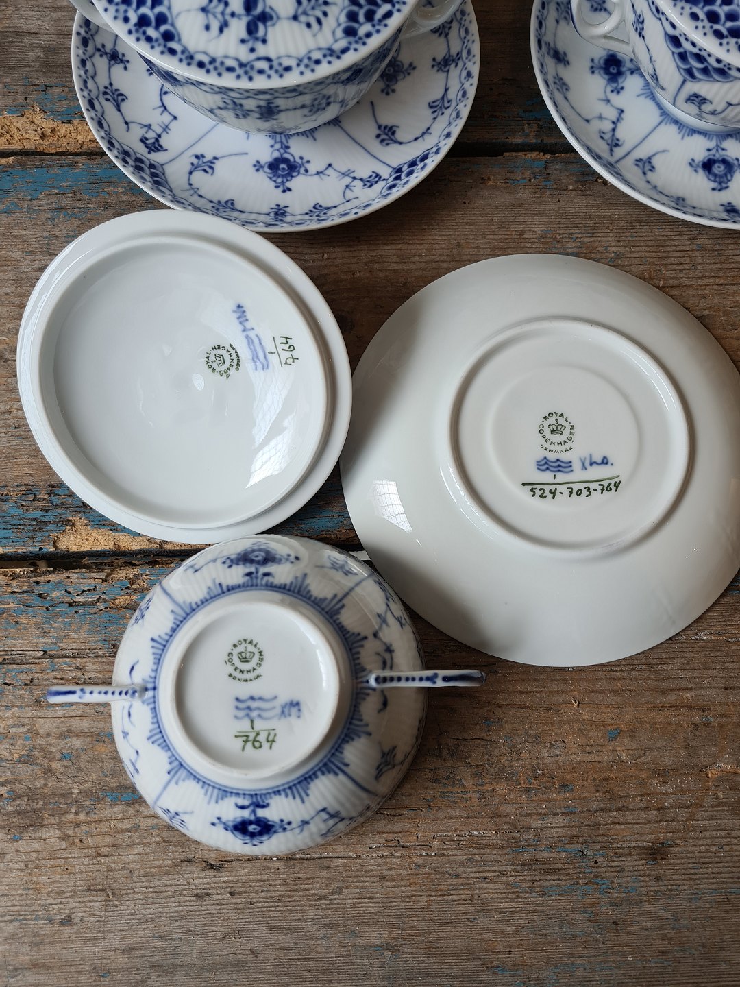 Royal Copenhagen Blue Fluted half-lace broth cup with lid and saucer No. 764