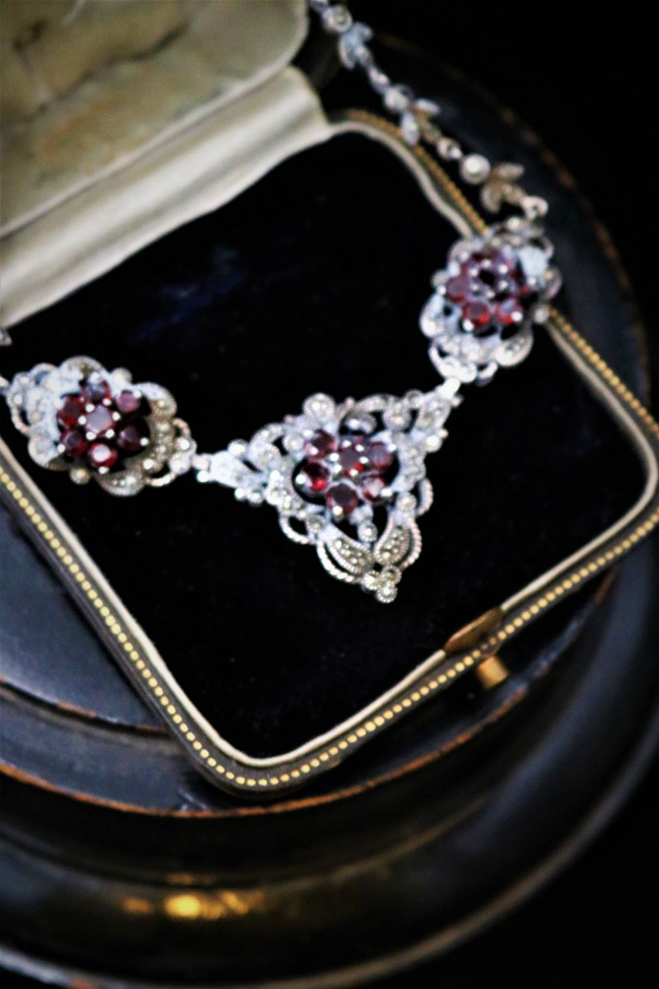 Fantastisk smuk gammel halskæde i sølv med fine røde granater. Stemplet. Længde: 44cm.