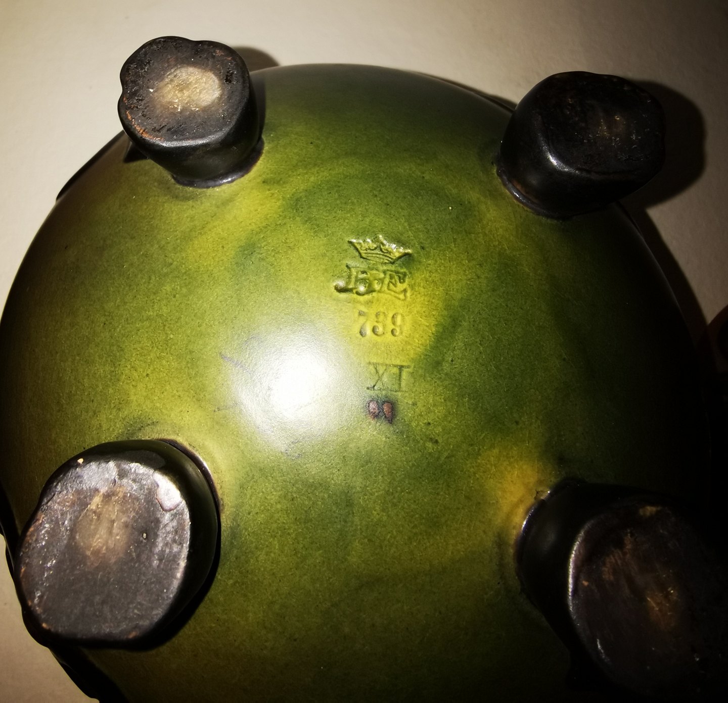 Urne eller lågkrukke stående på tre fødder i keramik fra Peter Ipsen´s Enke fra begyndelsen af 20. århundrede. Har et lille overflade skrab af manglende glasur (se foto med pilen). Ellers ingen defekter eller reparationer. Fabriksmærket på bunden med krone, PIE samt modelnummer 789. H. 19½ cm