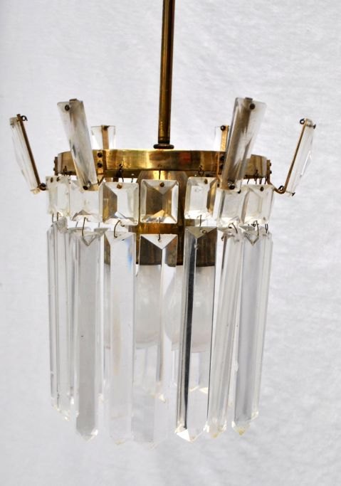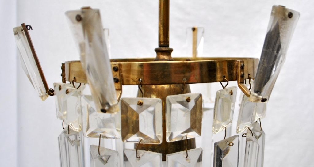 Art deco forsølvet loftslampe med prismer, ca. 1920 - 1930, Danmark. Øverste del med 6 oprette prismer. 18 aflange nedadhængende prismer. Dia.: 19,5 cm. Højde med montering: 62 cm.