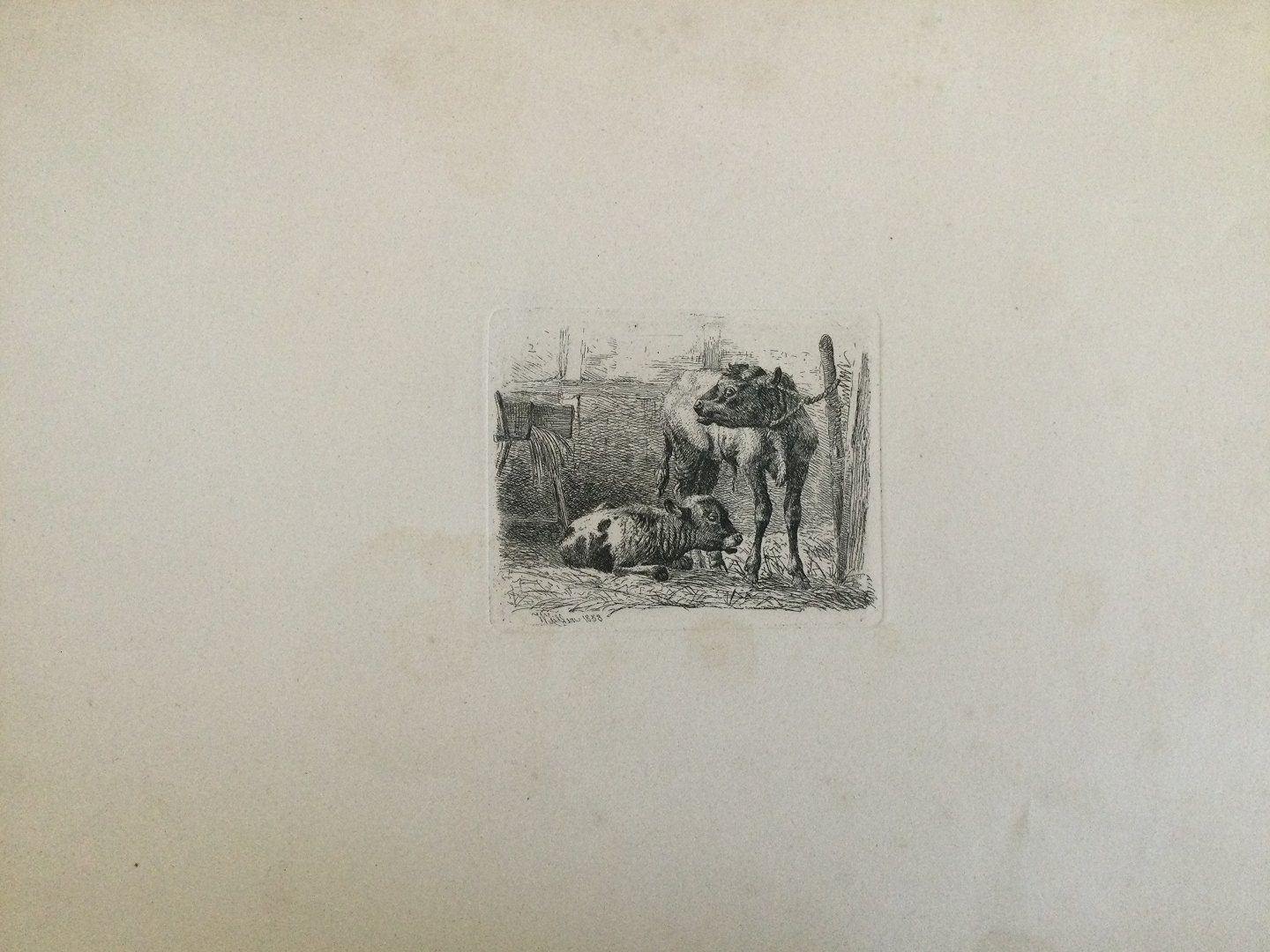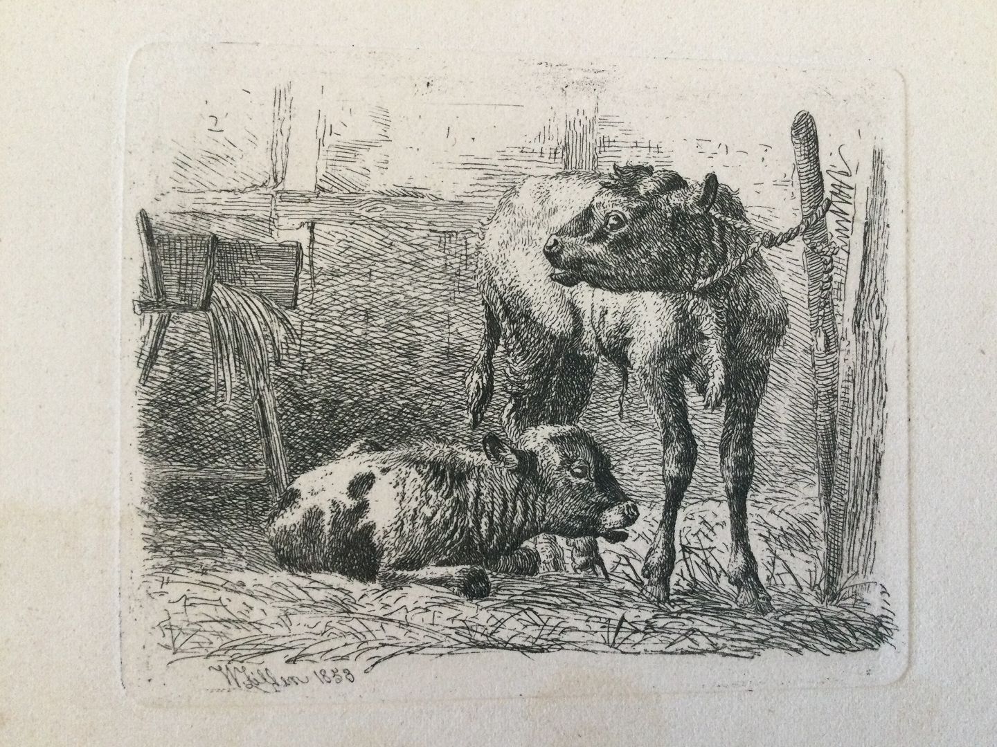 Radering af Johannes Vilhelm Zillen 1858 - To kalve i stald.