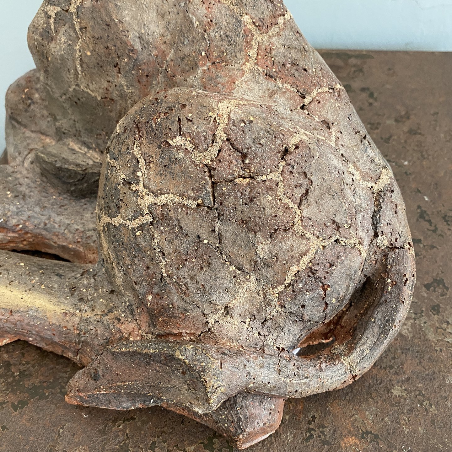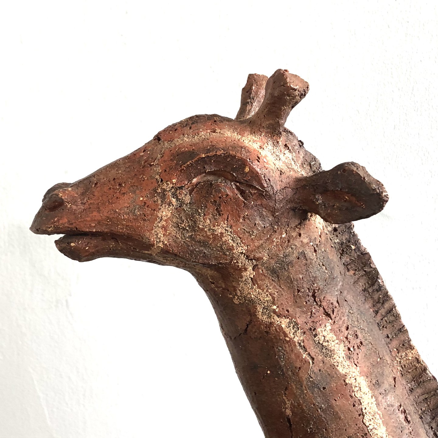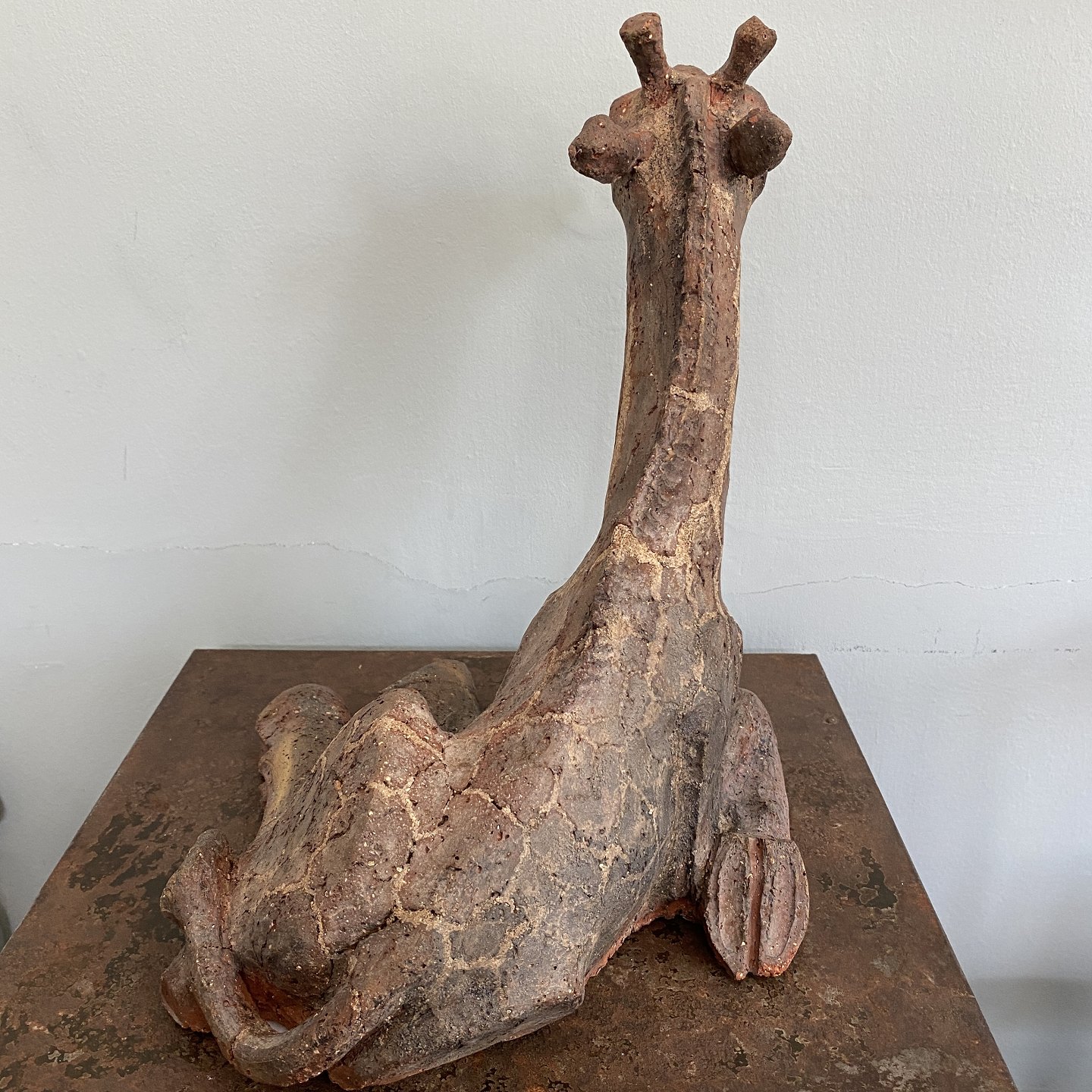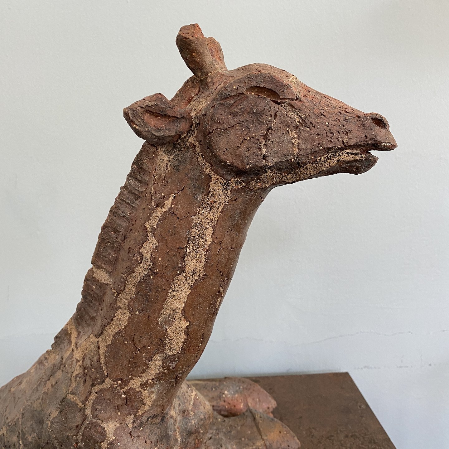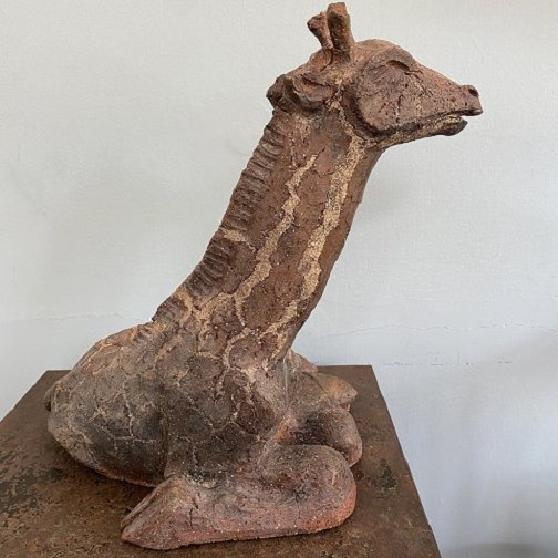 Figuren er usigneret. Ser ud til at være brændt i brænde/kulfyret ovn. Udført med en speciel teknik hvor revner er udfyldt med lysere materiale for at opnå lysere mønster som en naturlig giraf.