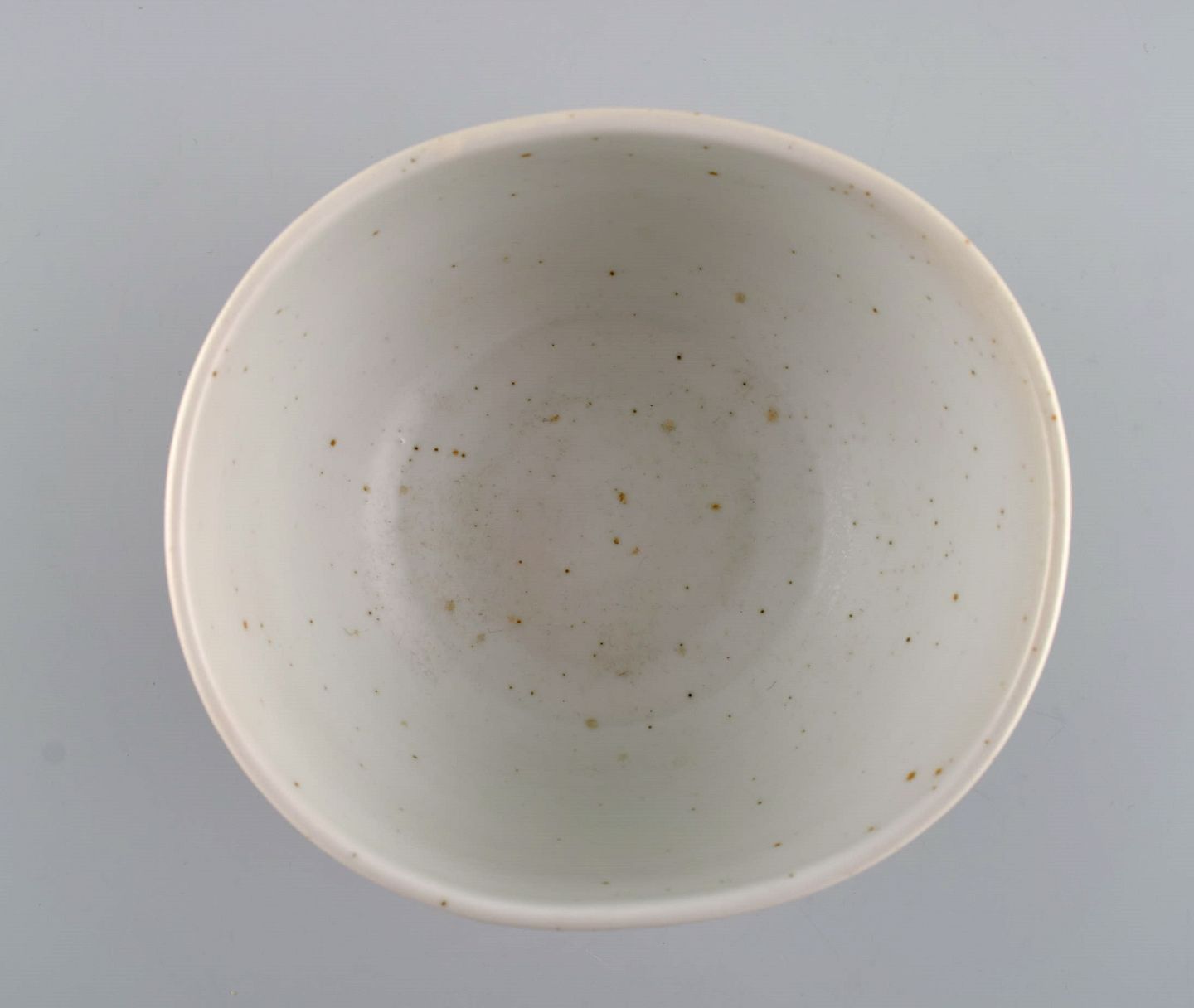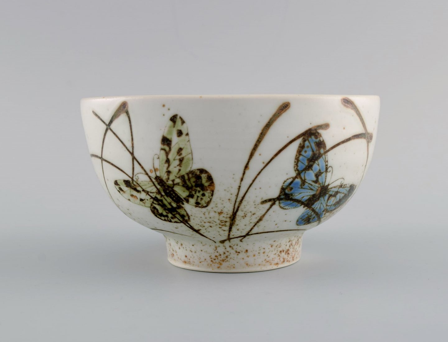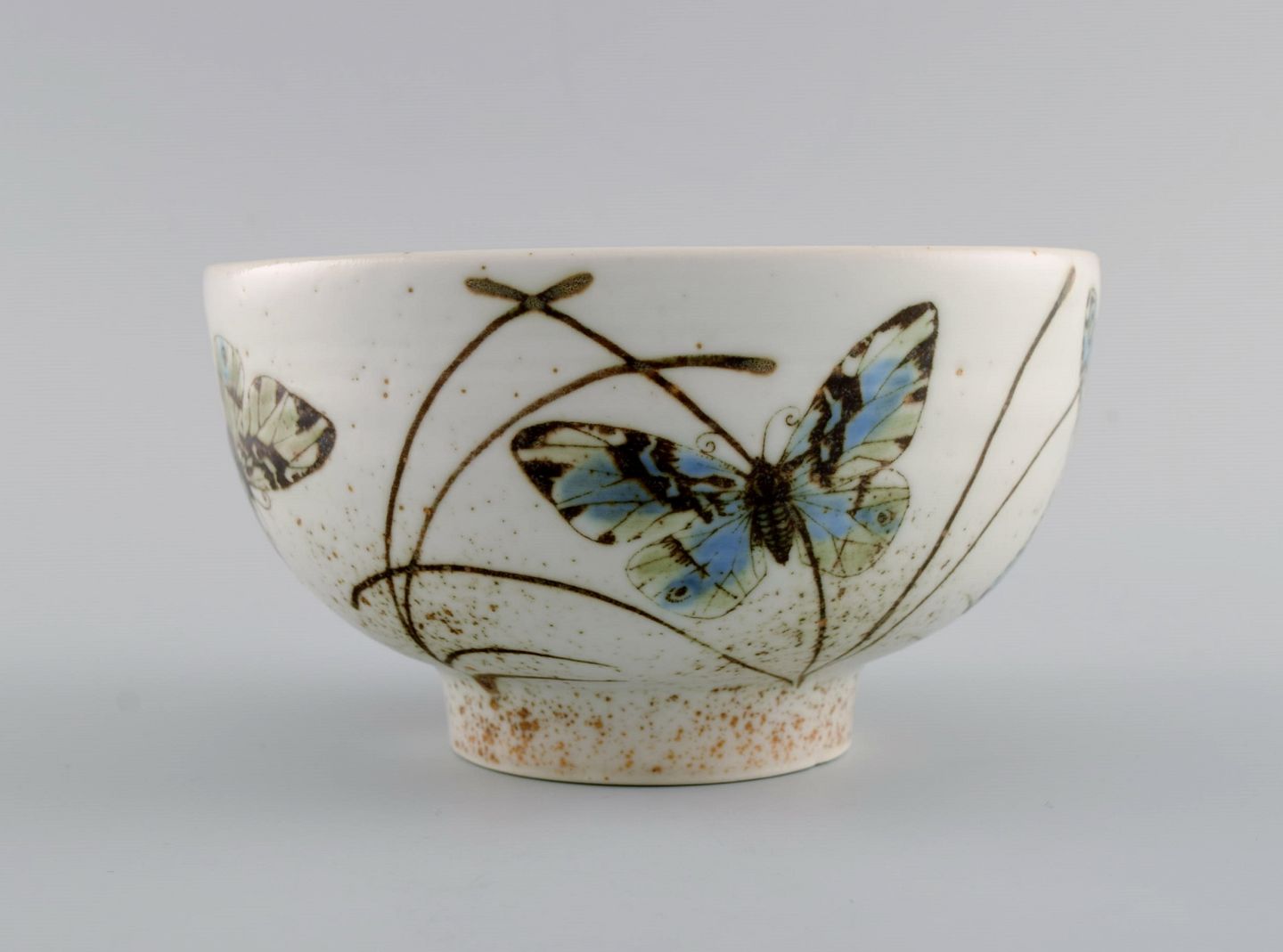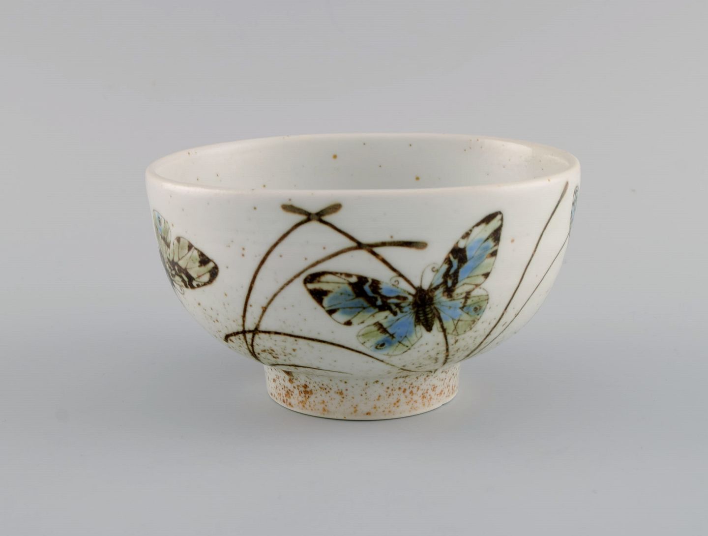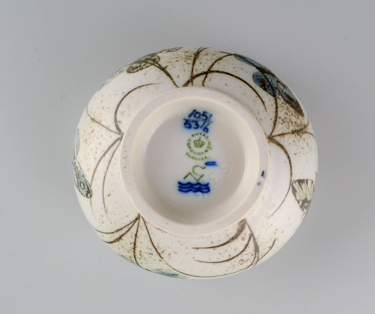Nils Thorsson for Royal Copenhagen. Sjælden skål i glaseret fajance dekoreret med sommerfugle. 1970'erne.