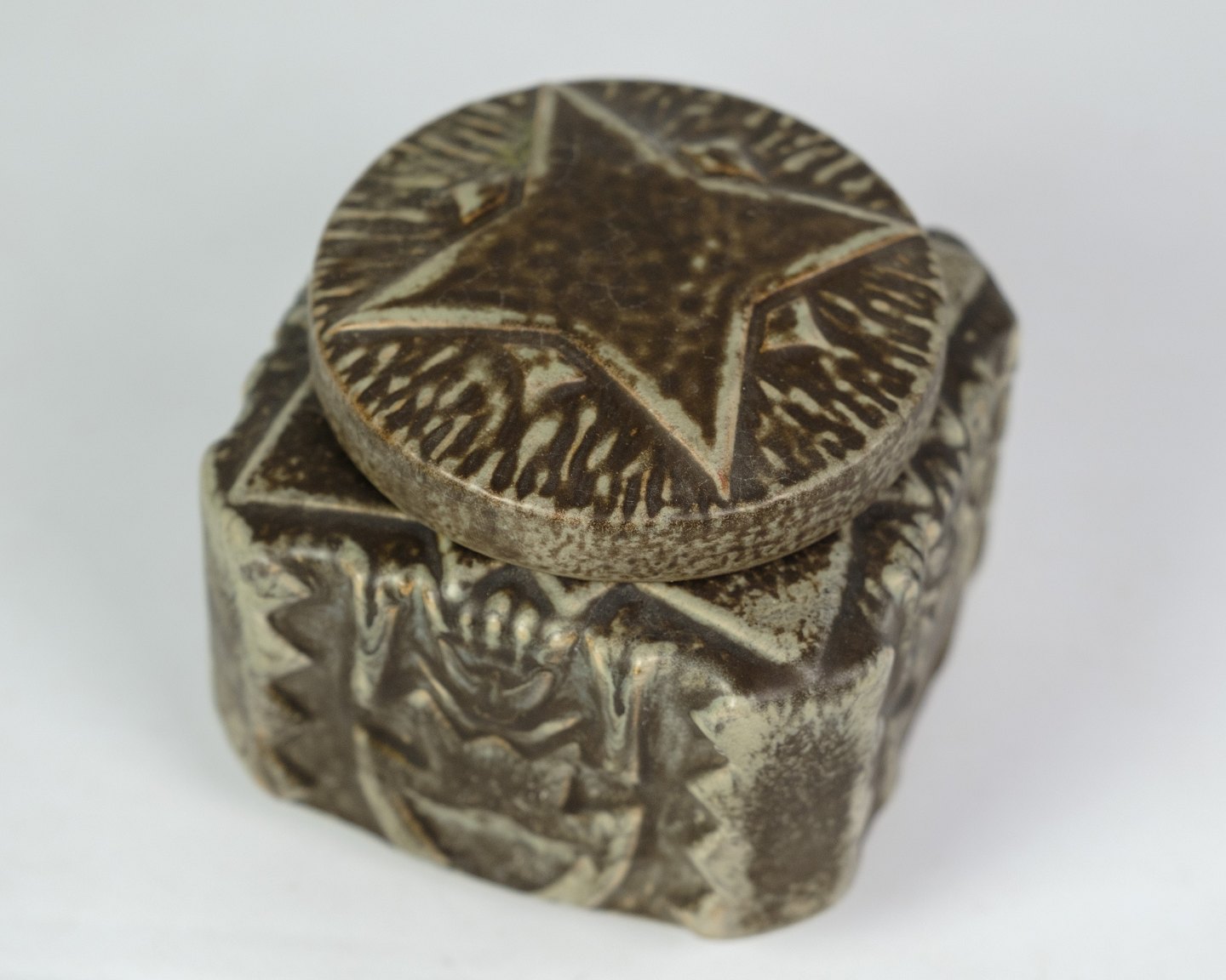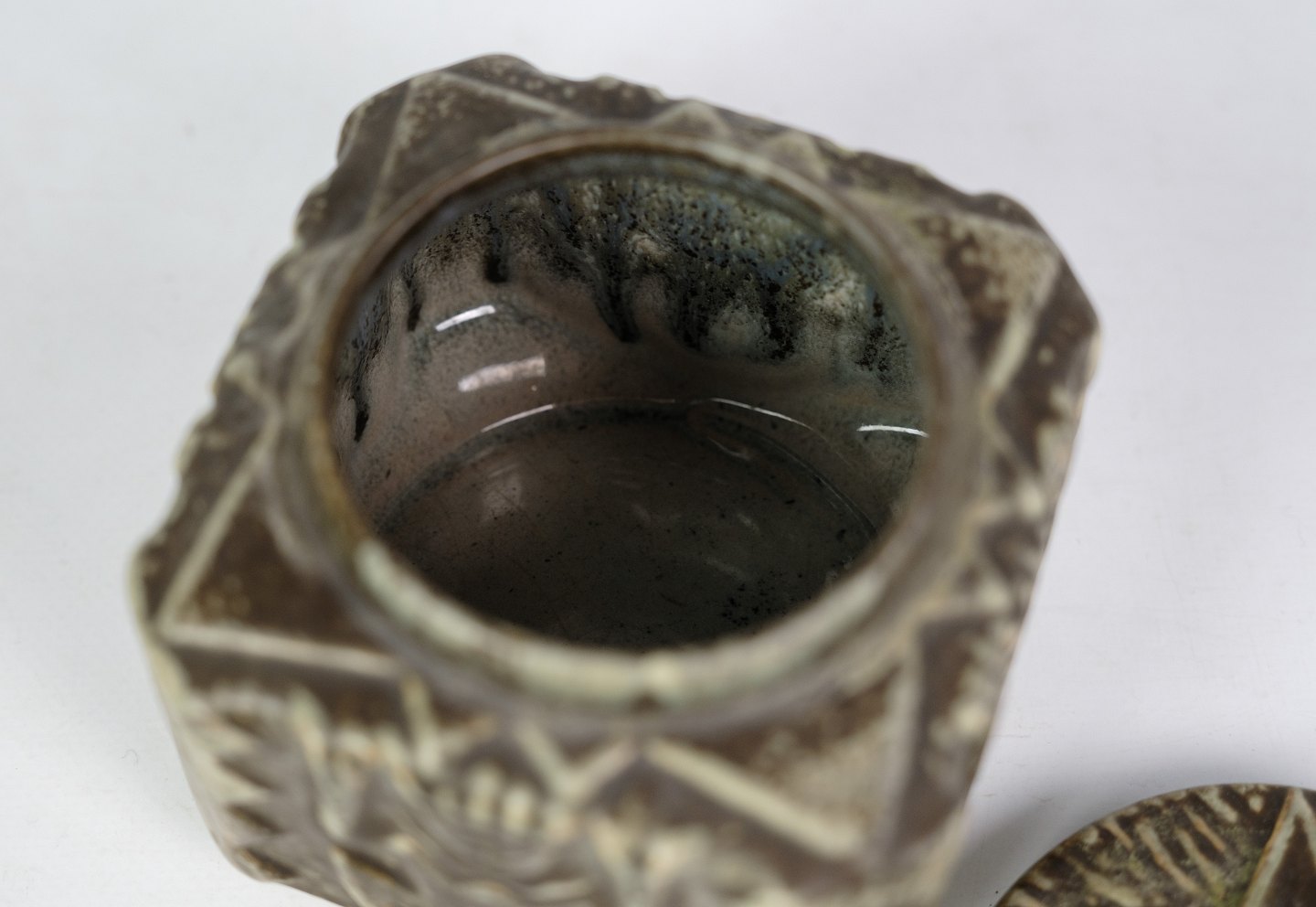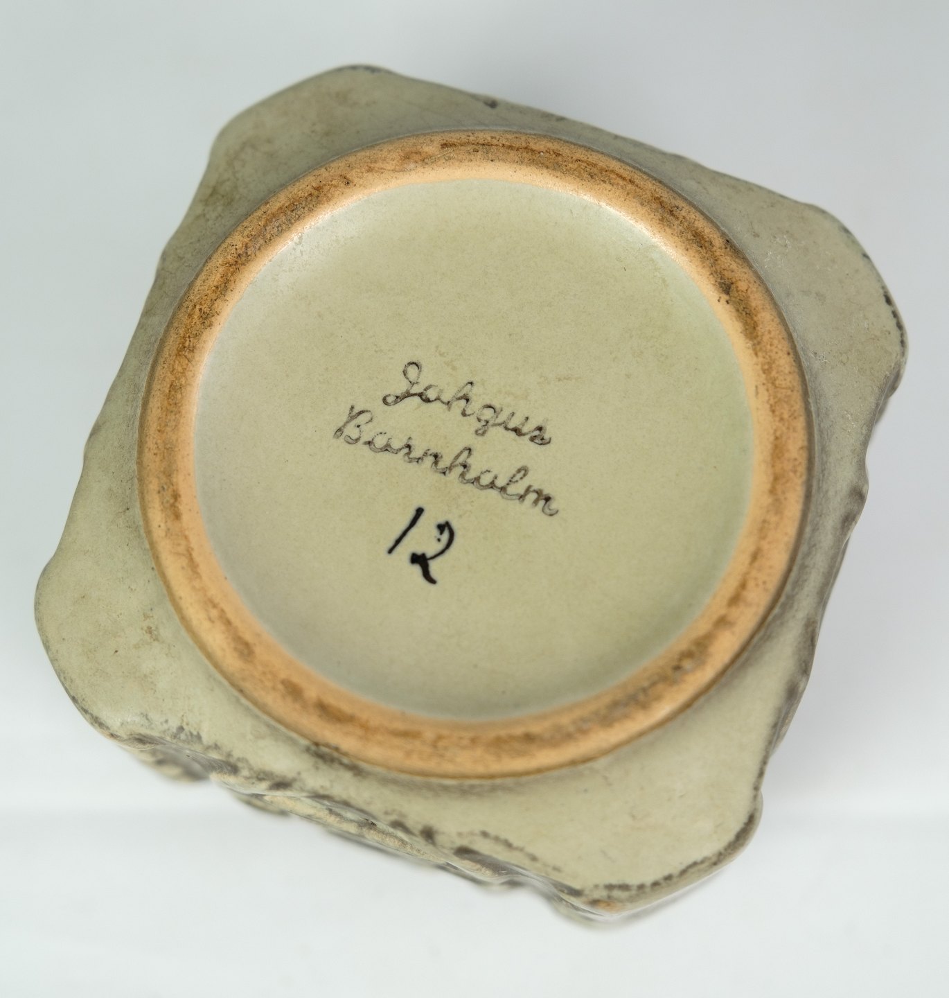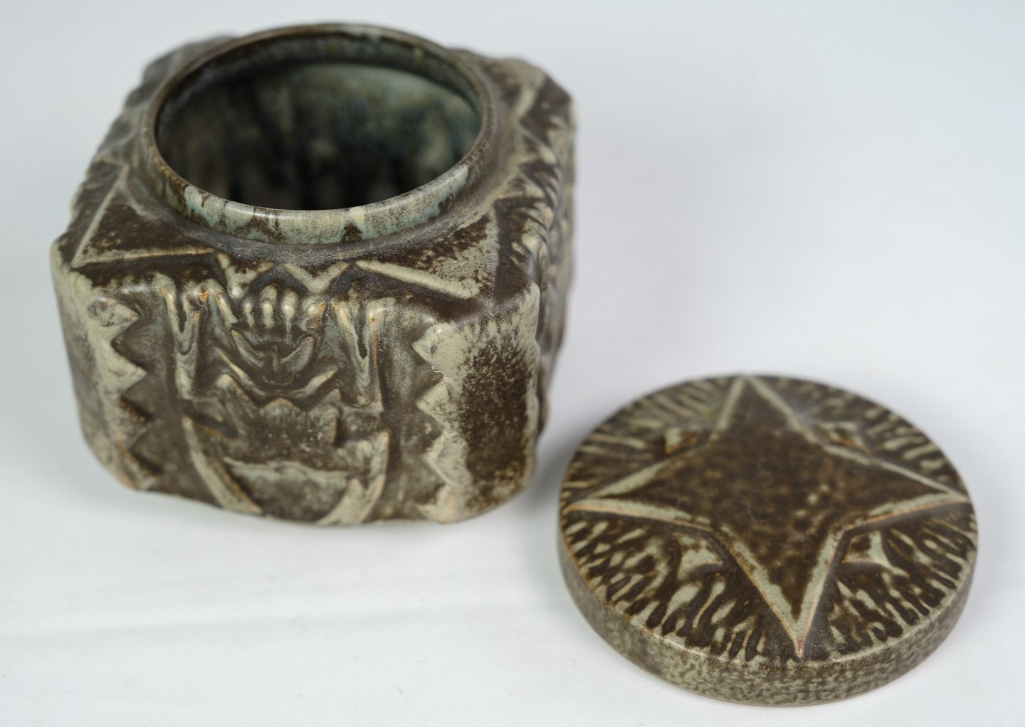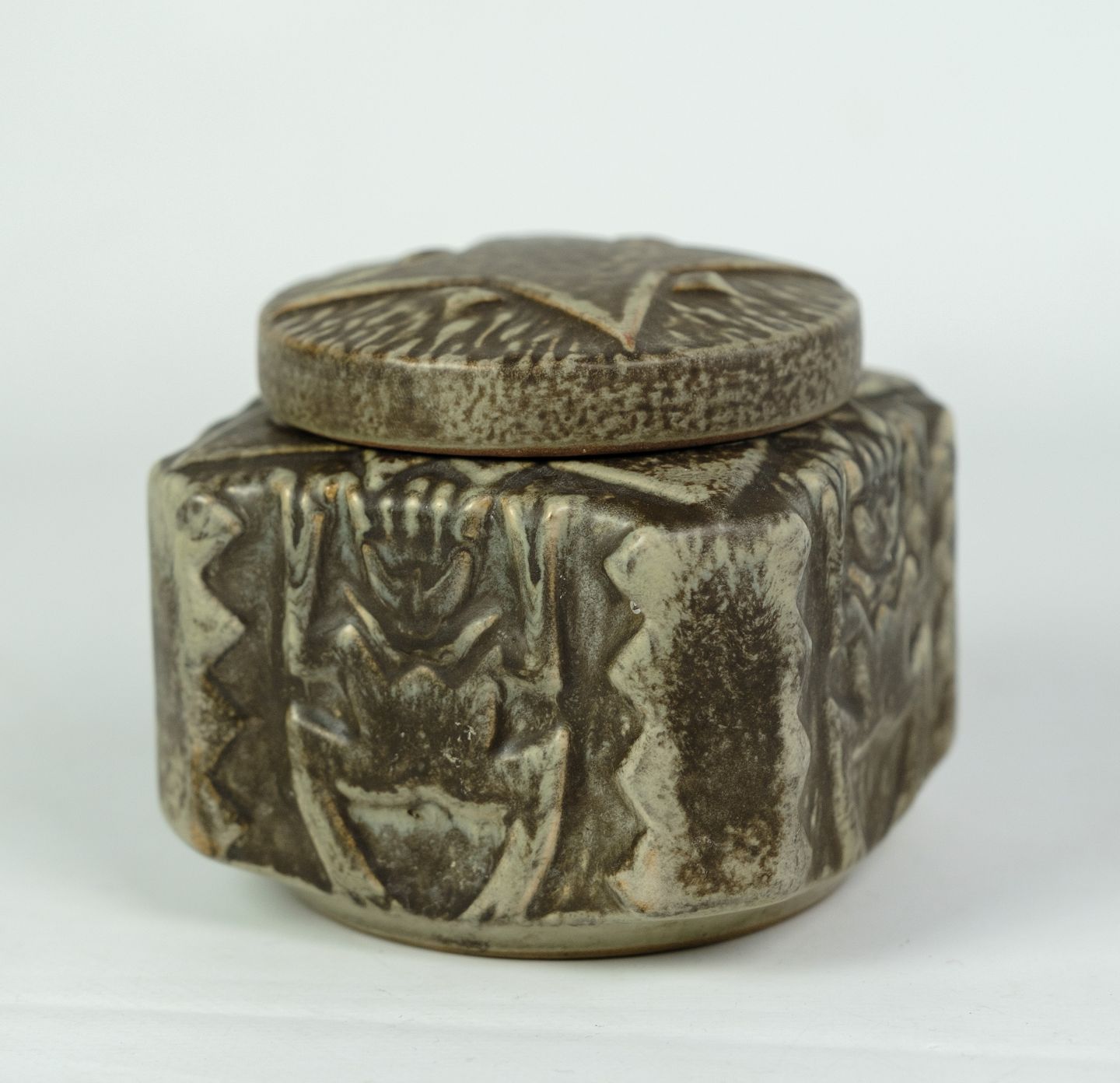 Keramik skål med låg af Johgus fra Bornholm omkring 1960'erne. Fabrikken Johgus i Rønne 1944 til 1999. Stiftet af Johannes Pedersen og Gustav Ottesen, deraf navnet JOHGUS Keramik. På fabrikken fremstillede Vaser, figurer, brugsgenstande og juleplatter fra 1949 som blev et stort samleobjekt.
