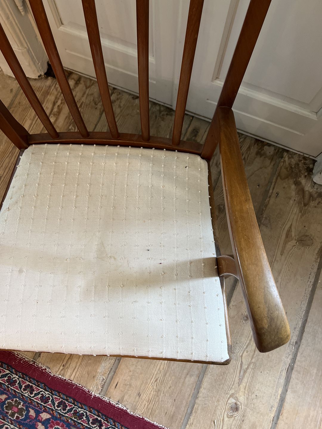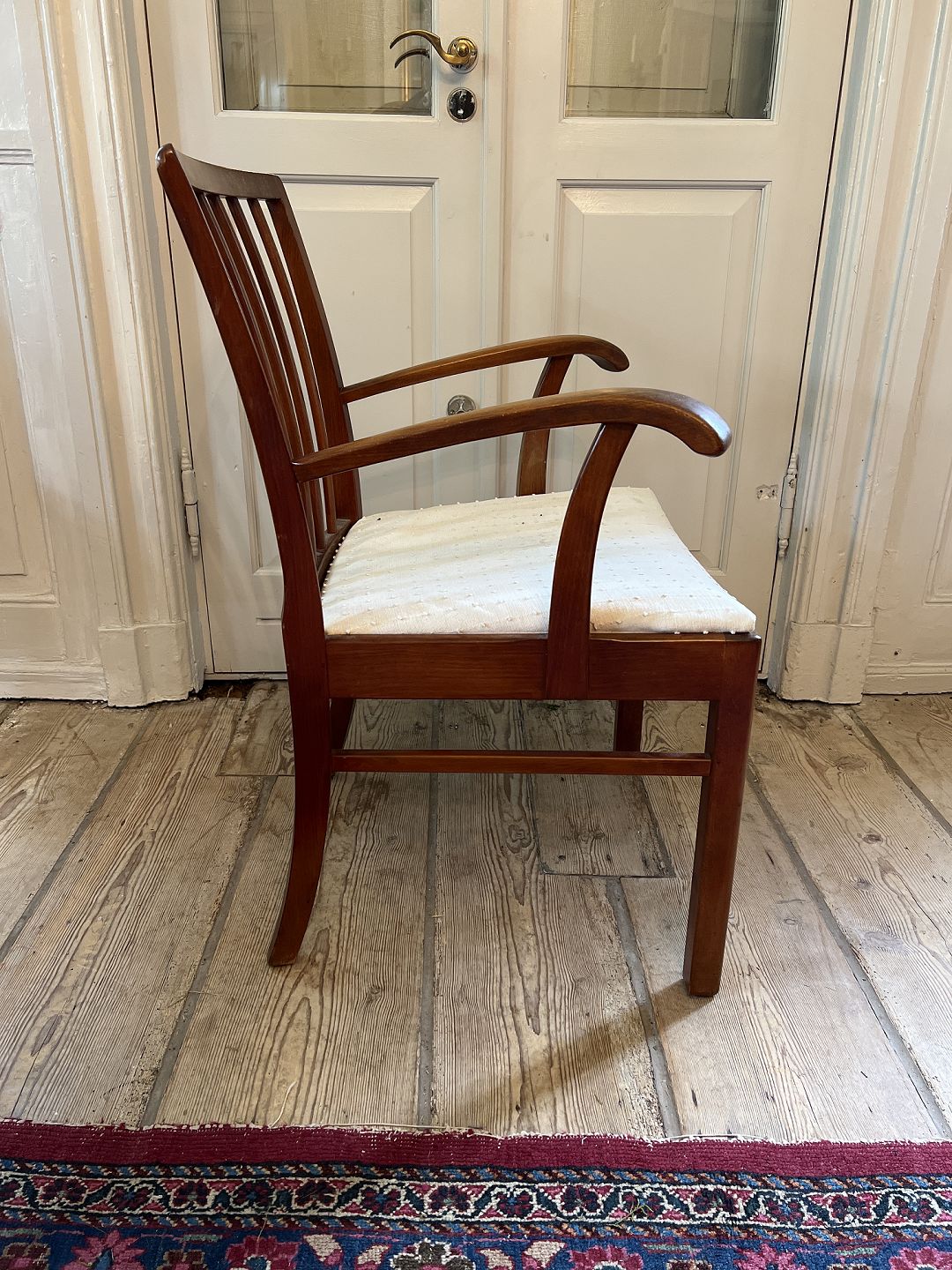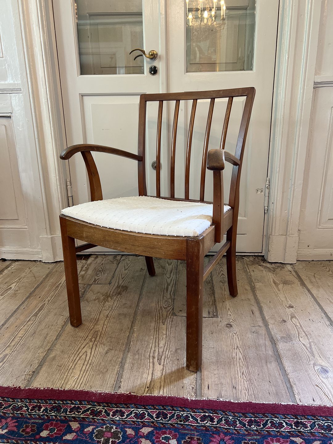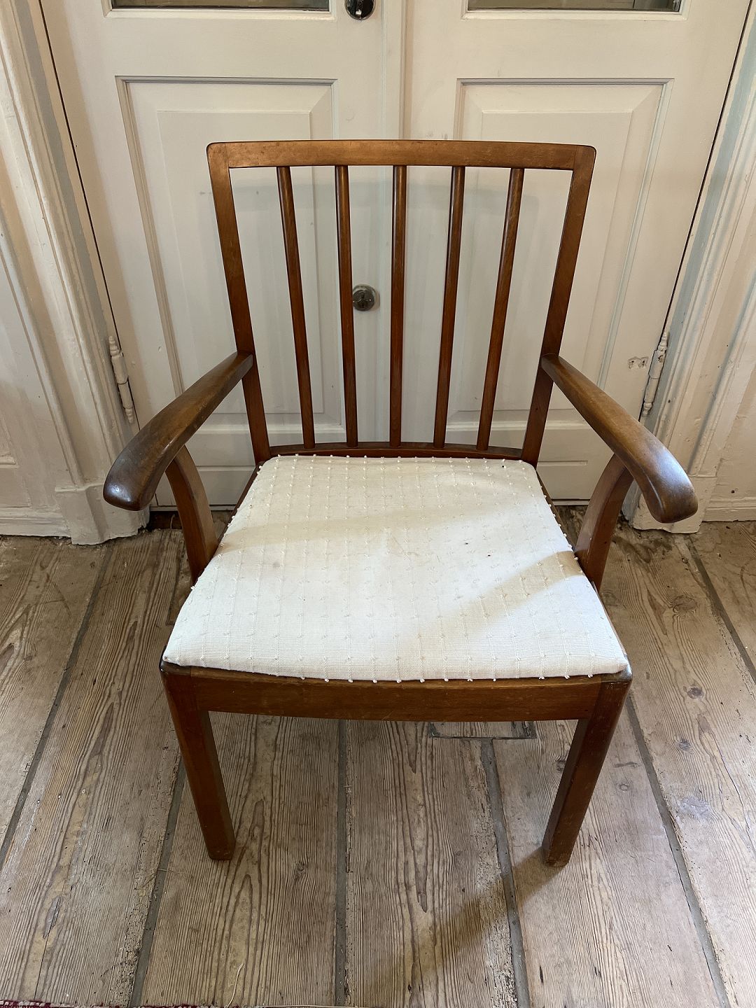 Text available in Danish: Dansk snedker armstol i bejdset bøgetræ sæde betrukket med hvidt stof. Udført ca. 1930'erne. Brugt stand fremstår med ridser og mæker, samt betræk med pletter.