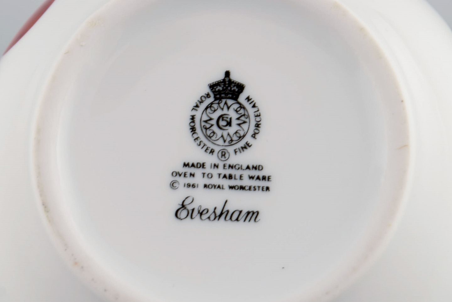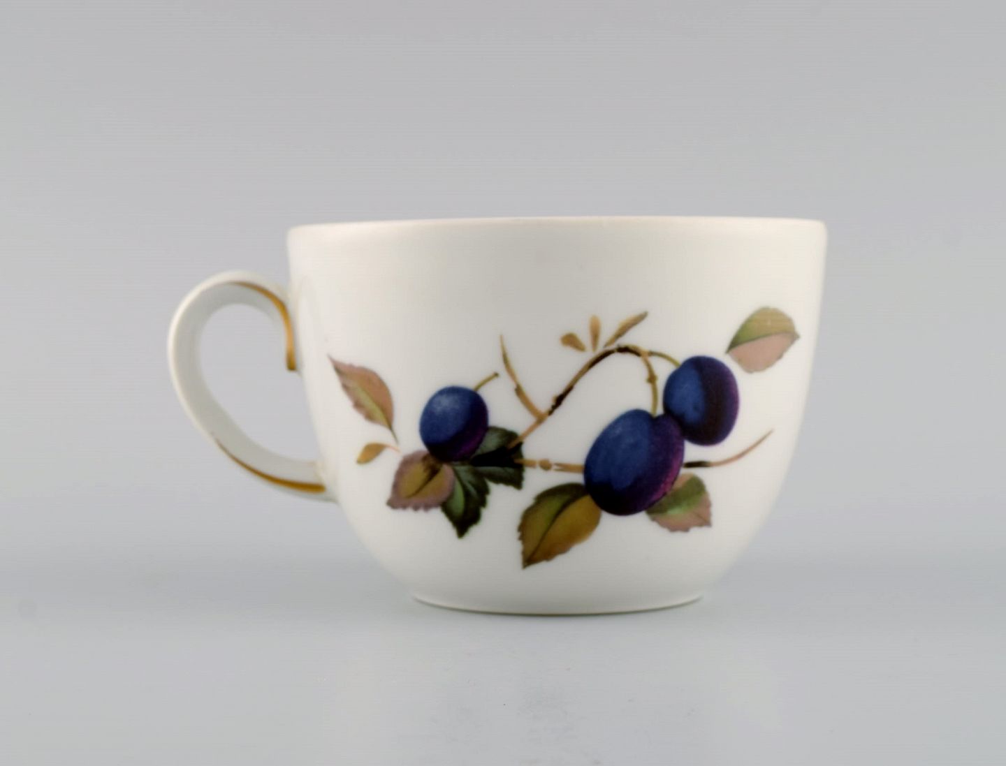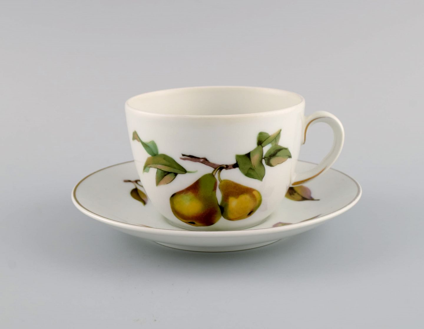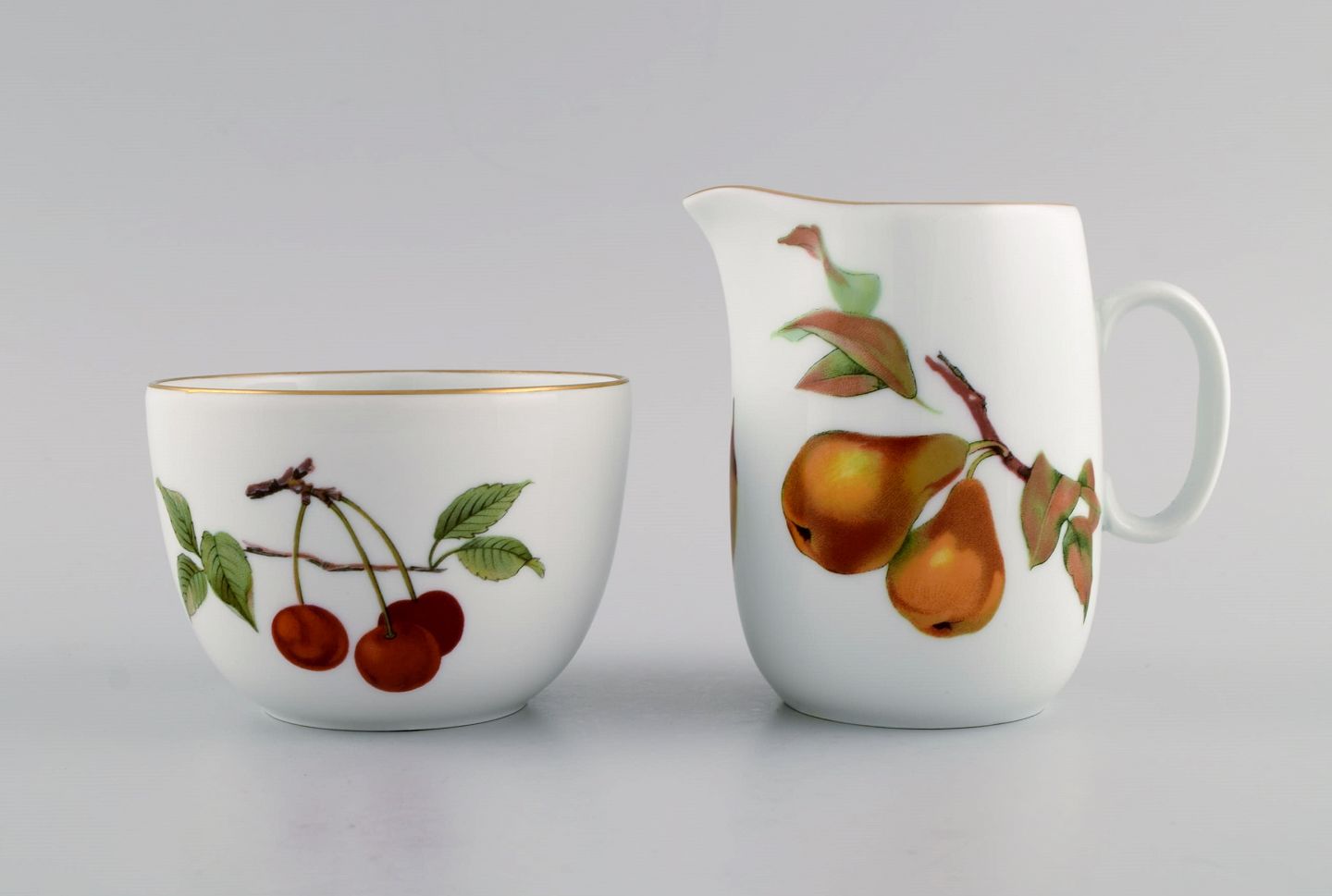 Royal Worcester, England. Evesham porcelain morning cup with sugar bowl and cream jug decorated with fruits and gold rim. 1980s.