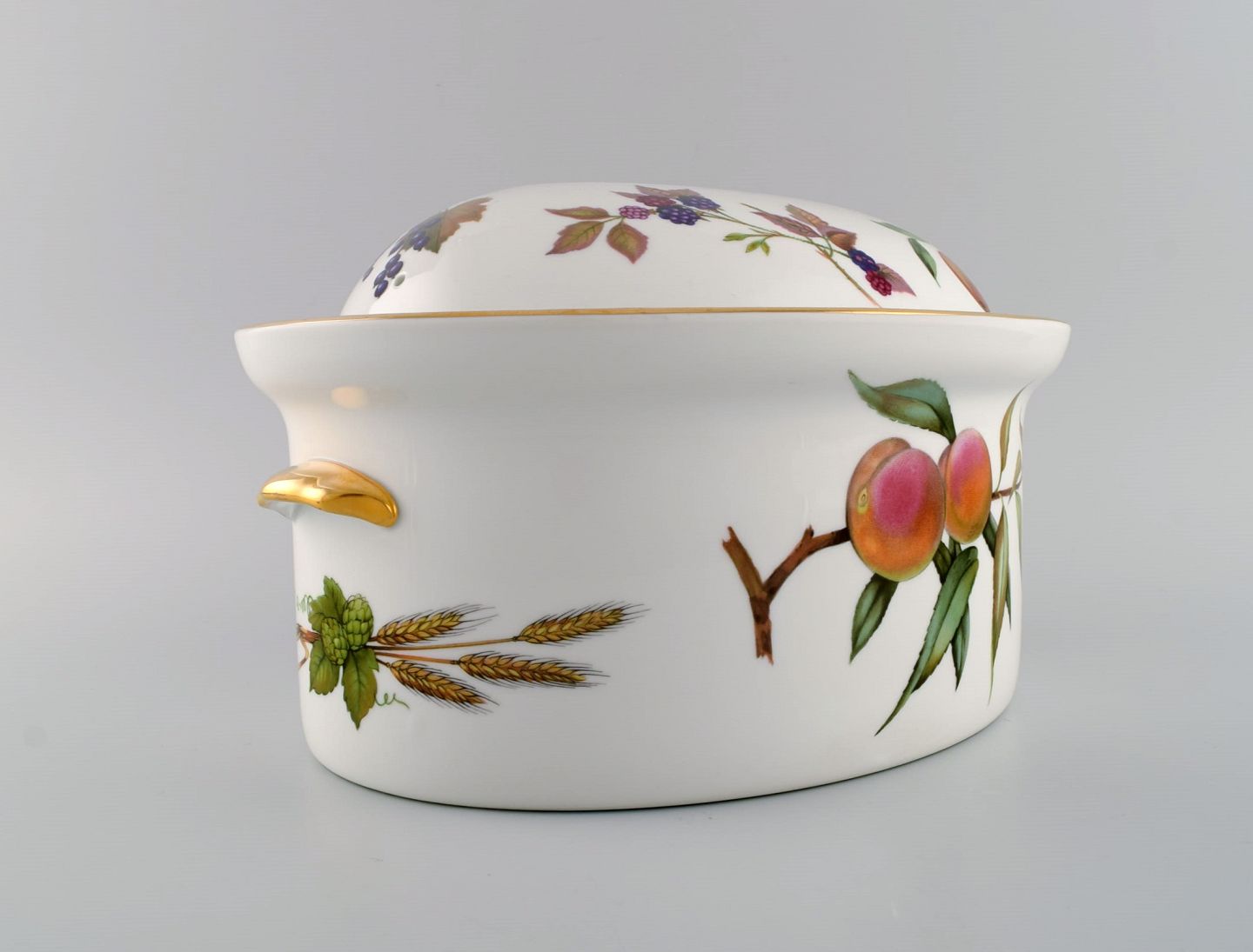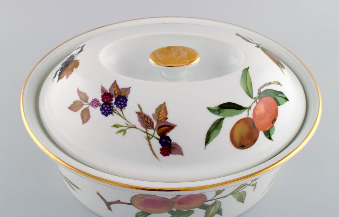 Royal Worcester, England. Stor Evesham lågterrin i porcelæn dekoreret med frugter og guldkant. 1980'erne.