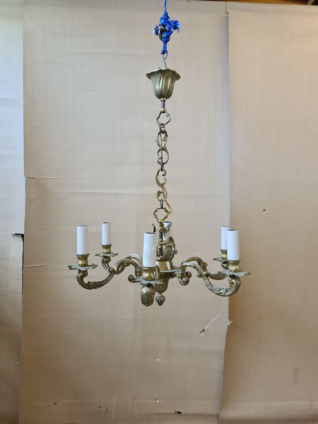 Lysekrone i metal med 6 arme, fra 1950erne.