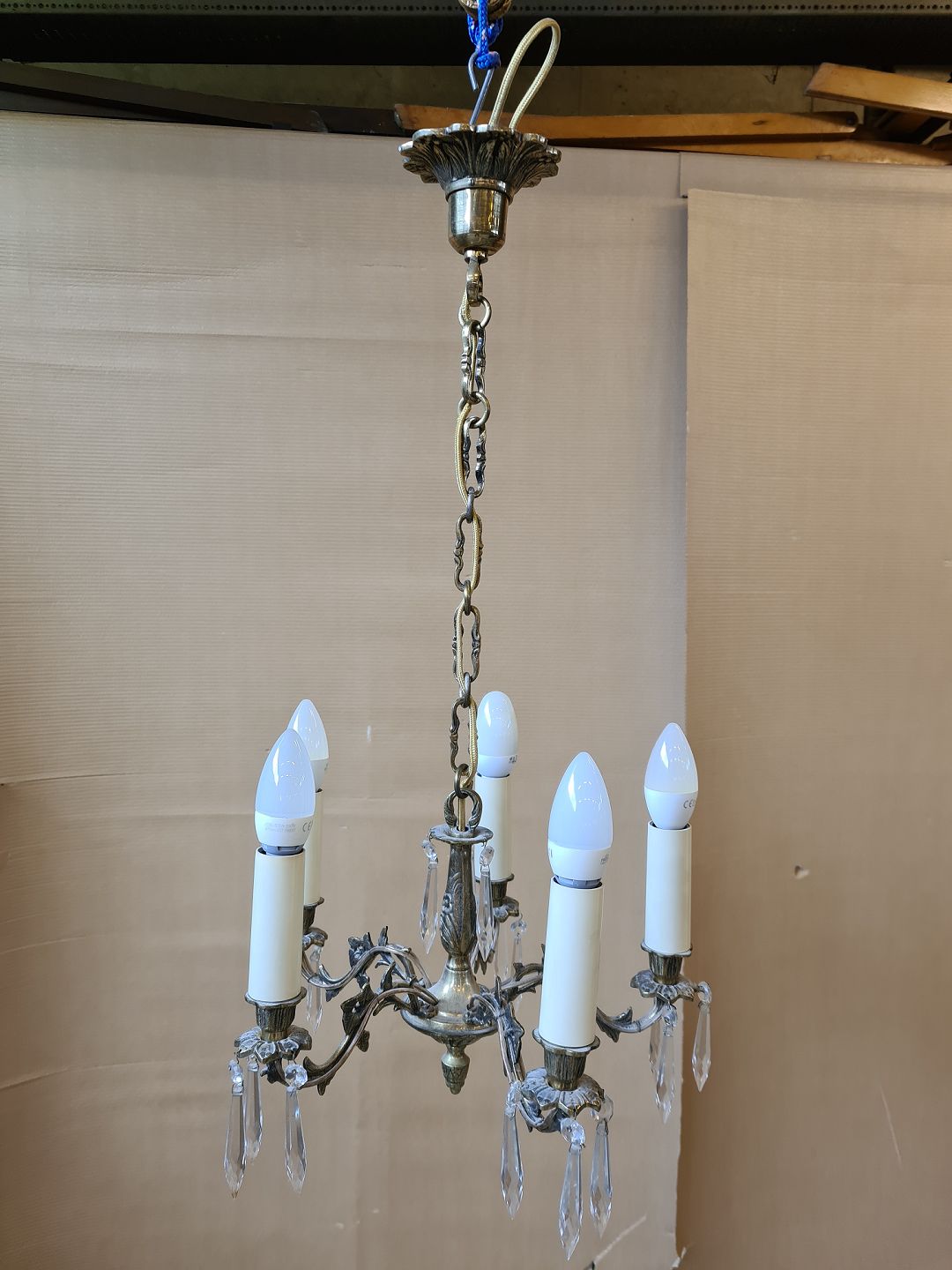 Lysekrone med prismer og 5 arme i messing, fra 1960erne.