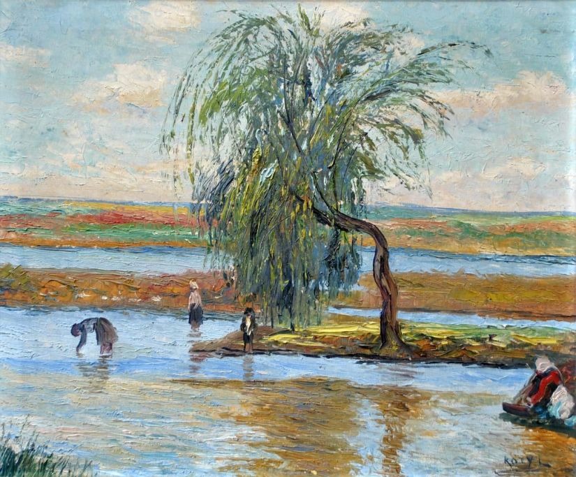 Koty, L (19. årh.): Kvinder på markarbejde. Olie på lærred. 51 x 61 cm.  Signeret Koty L.