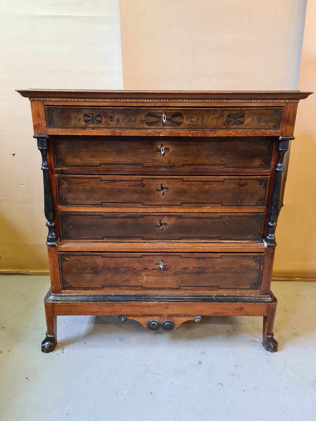 Dragkiste i massivt fyrretræ, fra det Herrens år 1861
