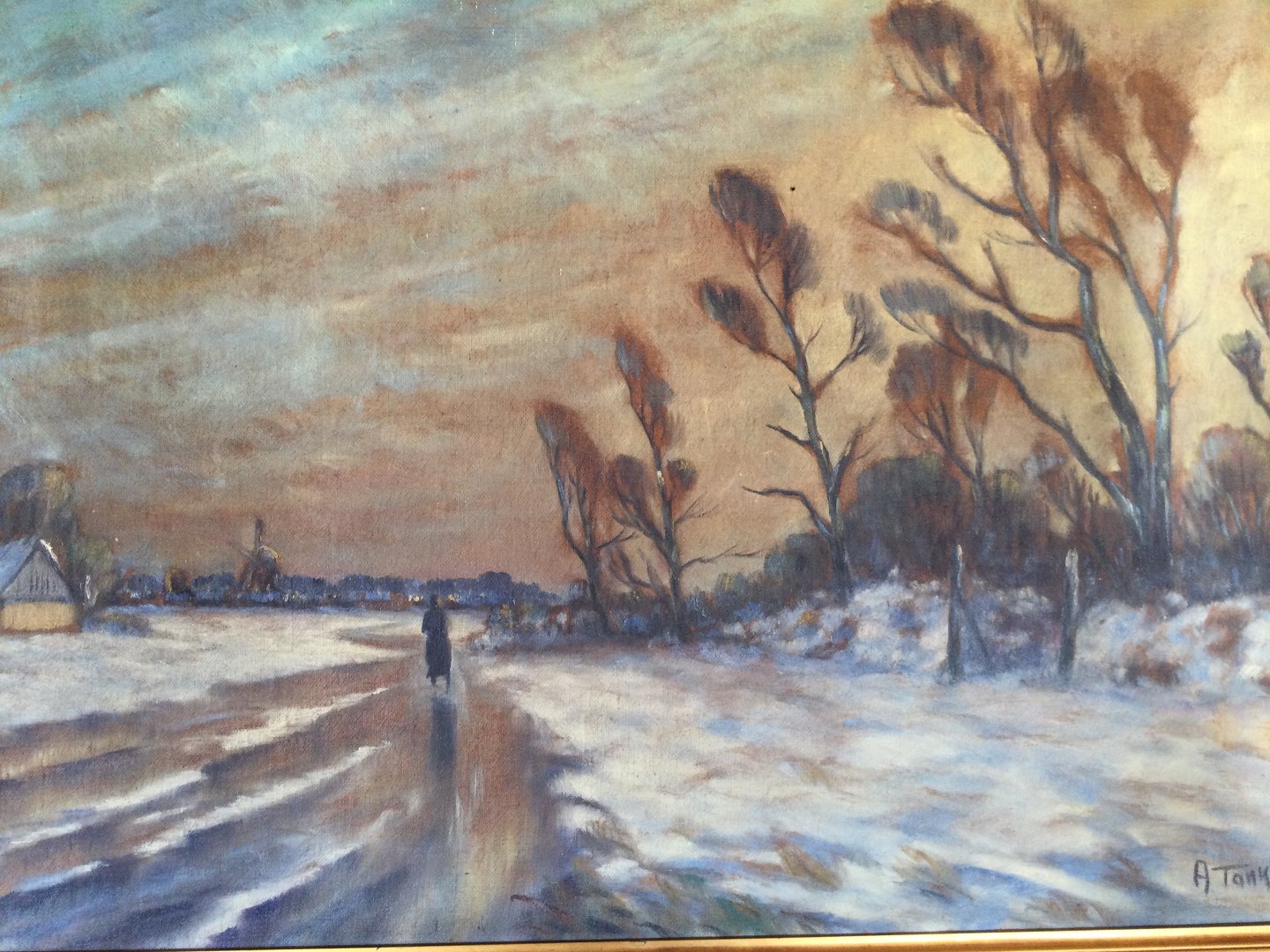 Maleri af Axel Tankmar - Vinterlandskab med personer på vej.