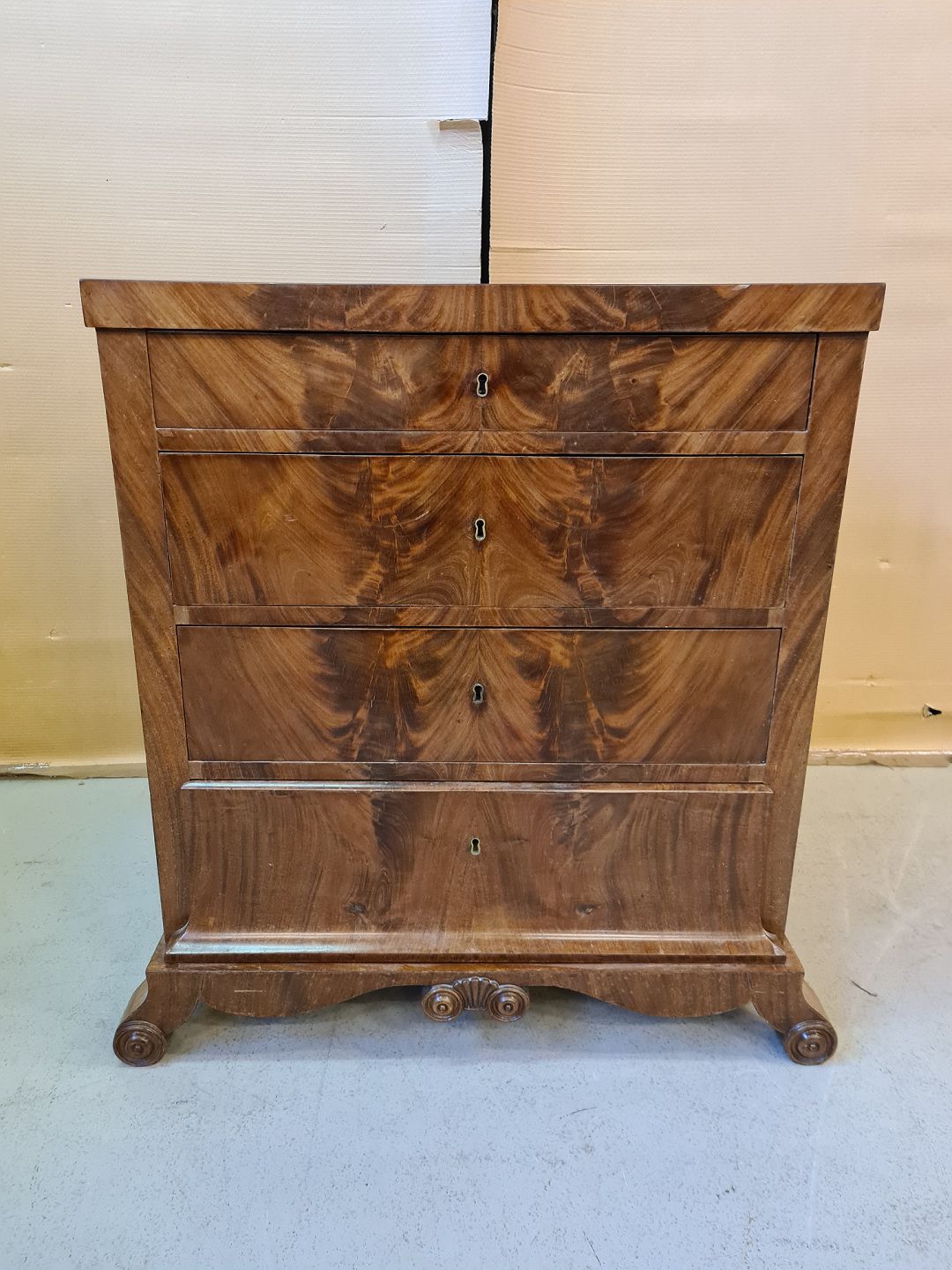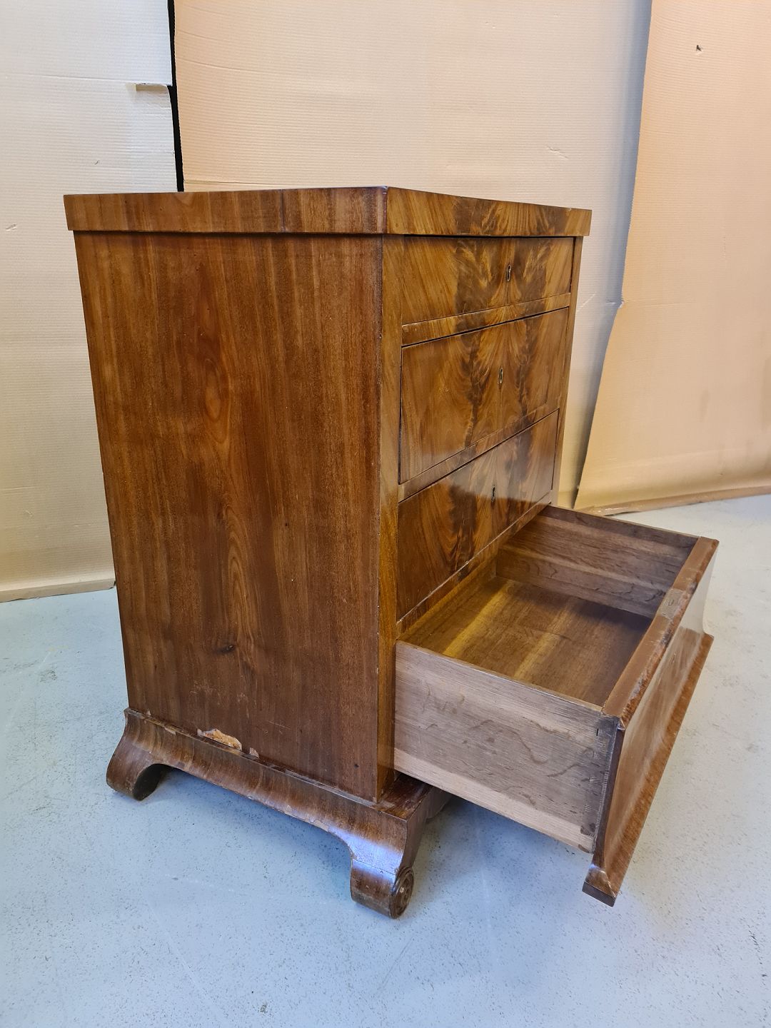 Kommode i fineret mahogni fra 1890erne.