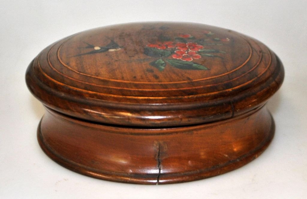 Sorrento box, 19th century Italy. Olive tree. With intarsia in the lid and paintings with swallows and flowers and the number: 36. Vaulted lid. Height: 4.5 cm. Dia.: 13.5 cm.