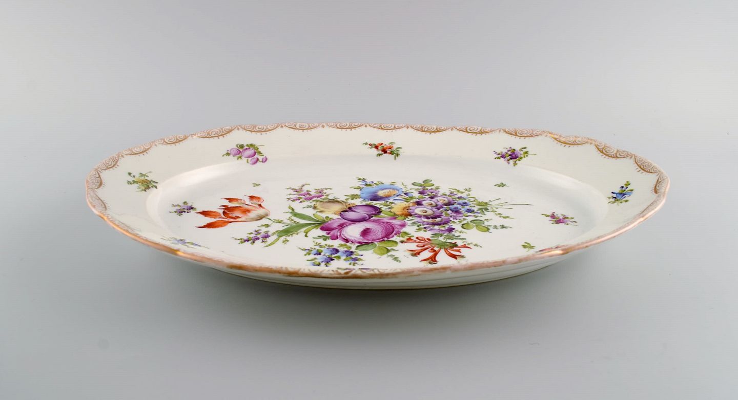 Stort Meissen serveringsfad i porcelæn med håndmalede blomster og gulddekoration. Sent 1800-tallet.