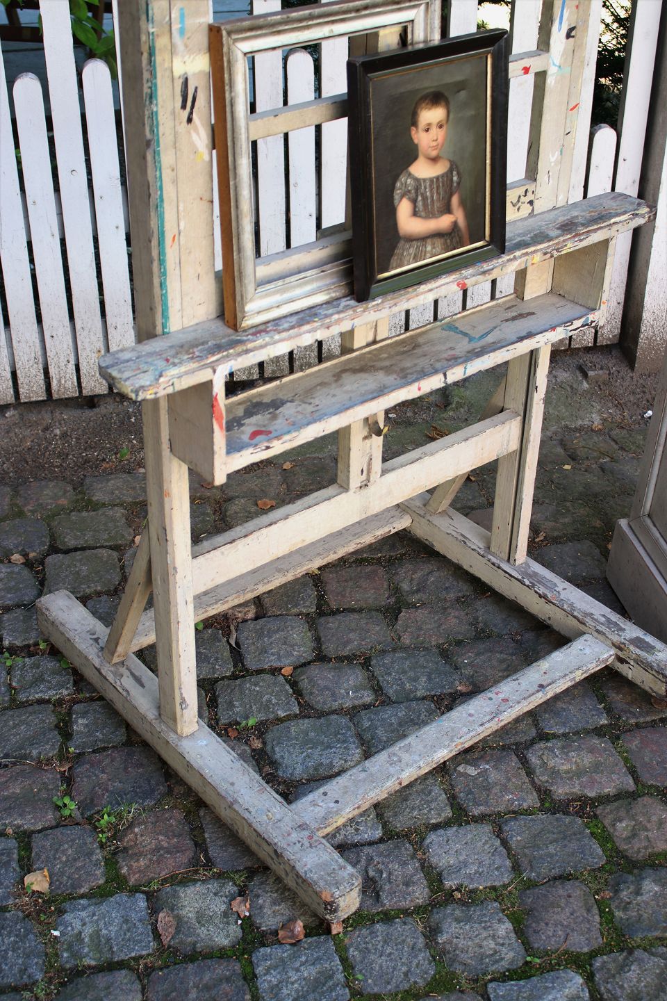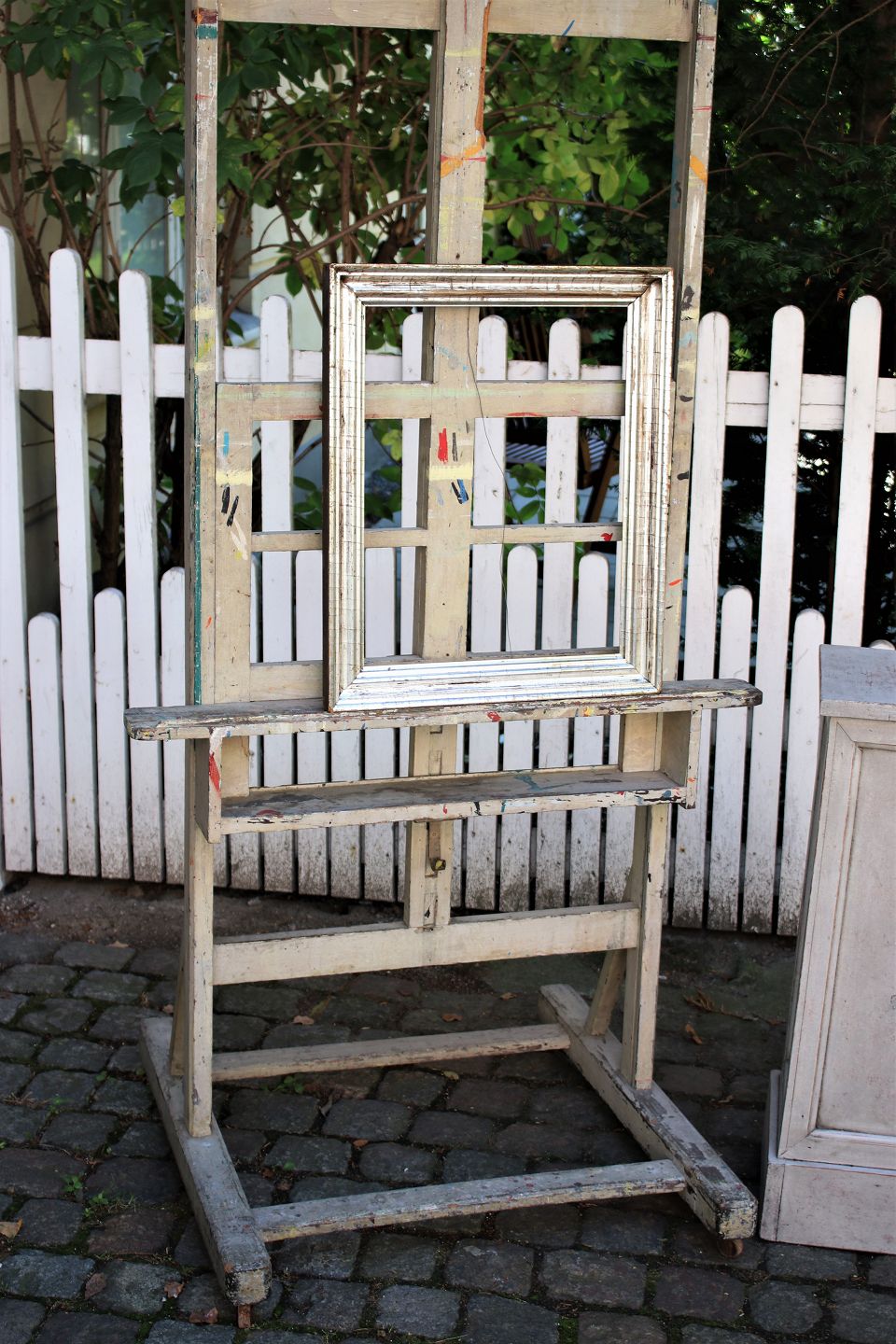 Decorative old painting easel in wooden gray color and with a super fine patina. Can be used to "exhibit" art on , a mirror or flat screen TV. The easel can be adjusted in height.