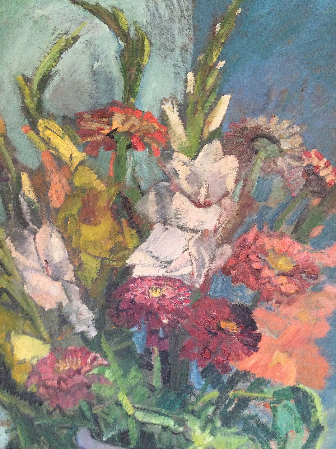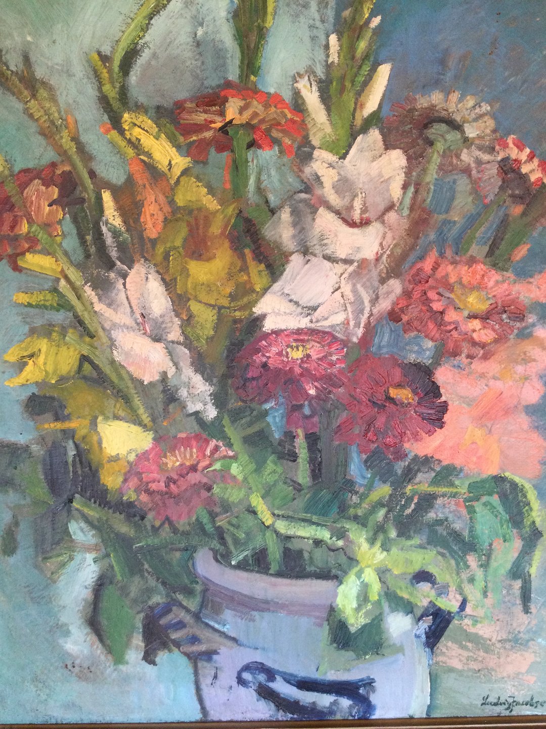 Maleri af Ludvig Jacobsen - Saltglasurskrukke med asters, krysantemer og gladiolus.