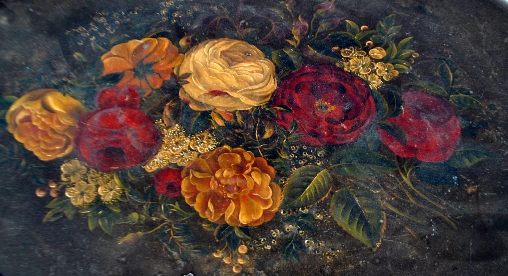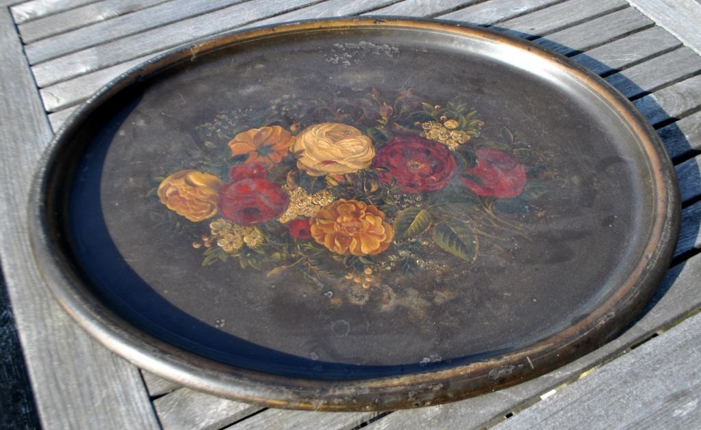 Oval painted serving tray of patinated metal, 19th century. Decorated with roses. L. 68. B. 54.