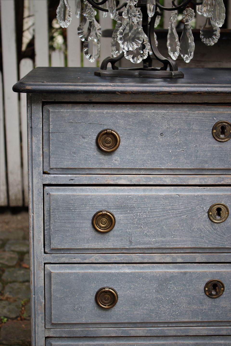 Fine, small old chest of drawers in fine patinated gray painted wood with black painted marbled top.