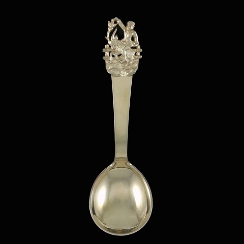 Rund barne/dessert-ske i forgyldt sølv med motiv fra H.C. Andersens eventyr.