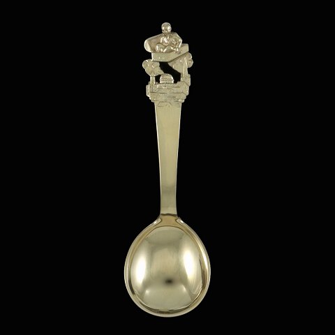 Rund barne/dessert-ske i forgyldt sølv med motiv fra H.C. Andersens eventyr.