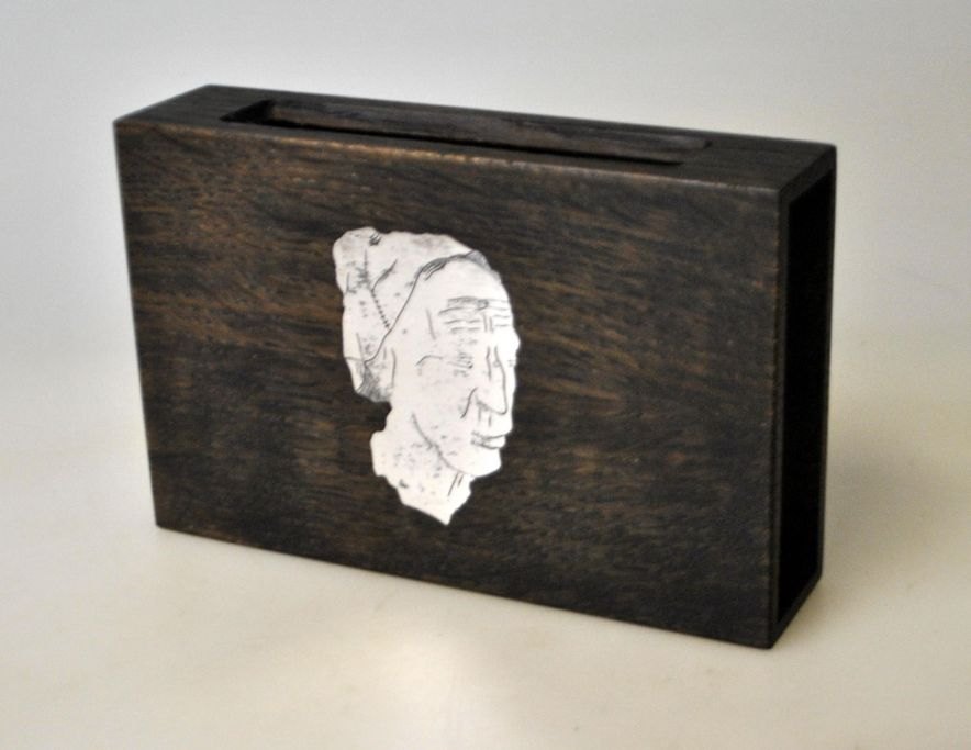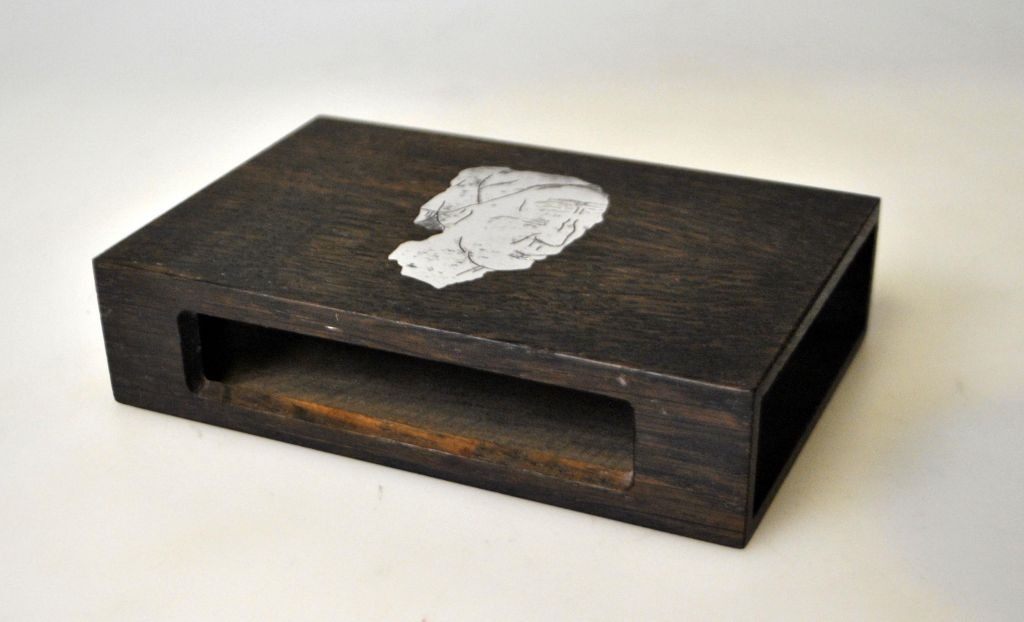 Andersen & Søhoel tændstikæske holder i moseeg med sterling sølvindlægning med motiv af Tollundmanden, 1950-60'erne, Aarhus, Danmark. 7,5 x 11,5 x 2,8 cm. Udarbejdet af Andersen & Søhoel, Christiansgade, 8000 Aarhus.  Virkelig flot - og sjælden! NB. Der ydes ingen rabat på dette lot.