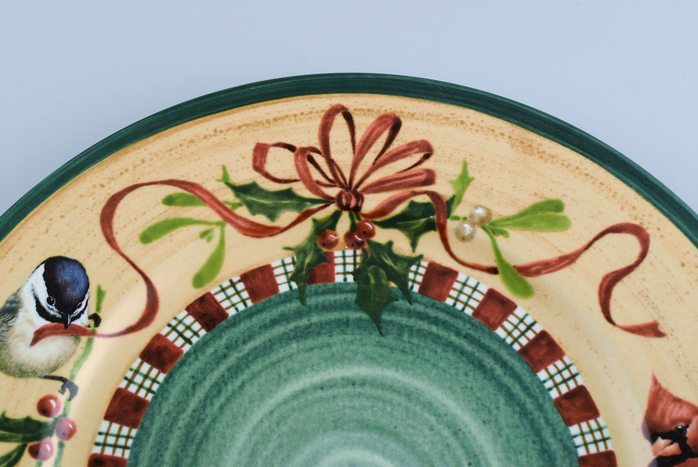 Catherine McClung for Lenox. "Winter greetings". Stort rundt fad i glaseret stentøj dekoreret med mistelten, fugle og rødt bånd. Ca. 2000.