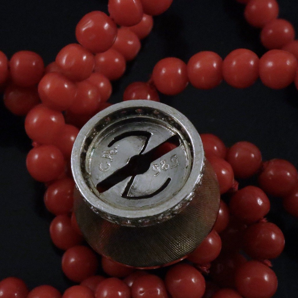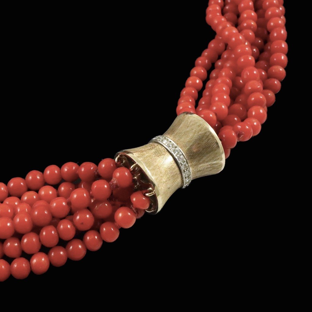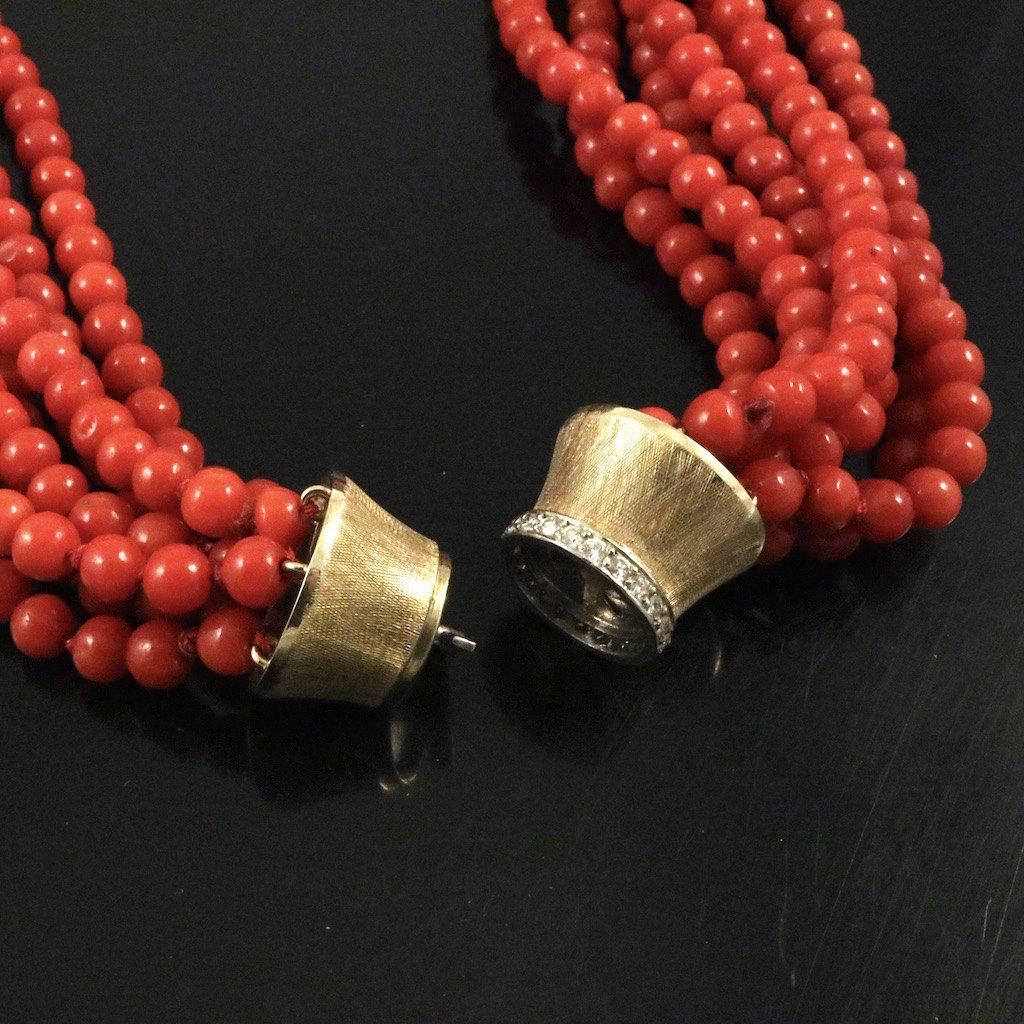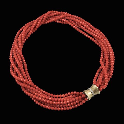Ni-radet koral halskæde med lås i 14k guld med 21 diamanter 0.30ct.