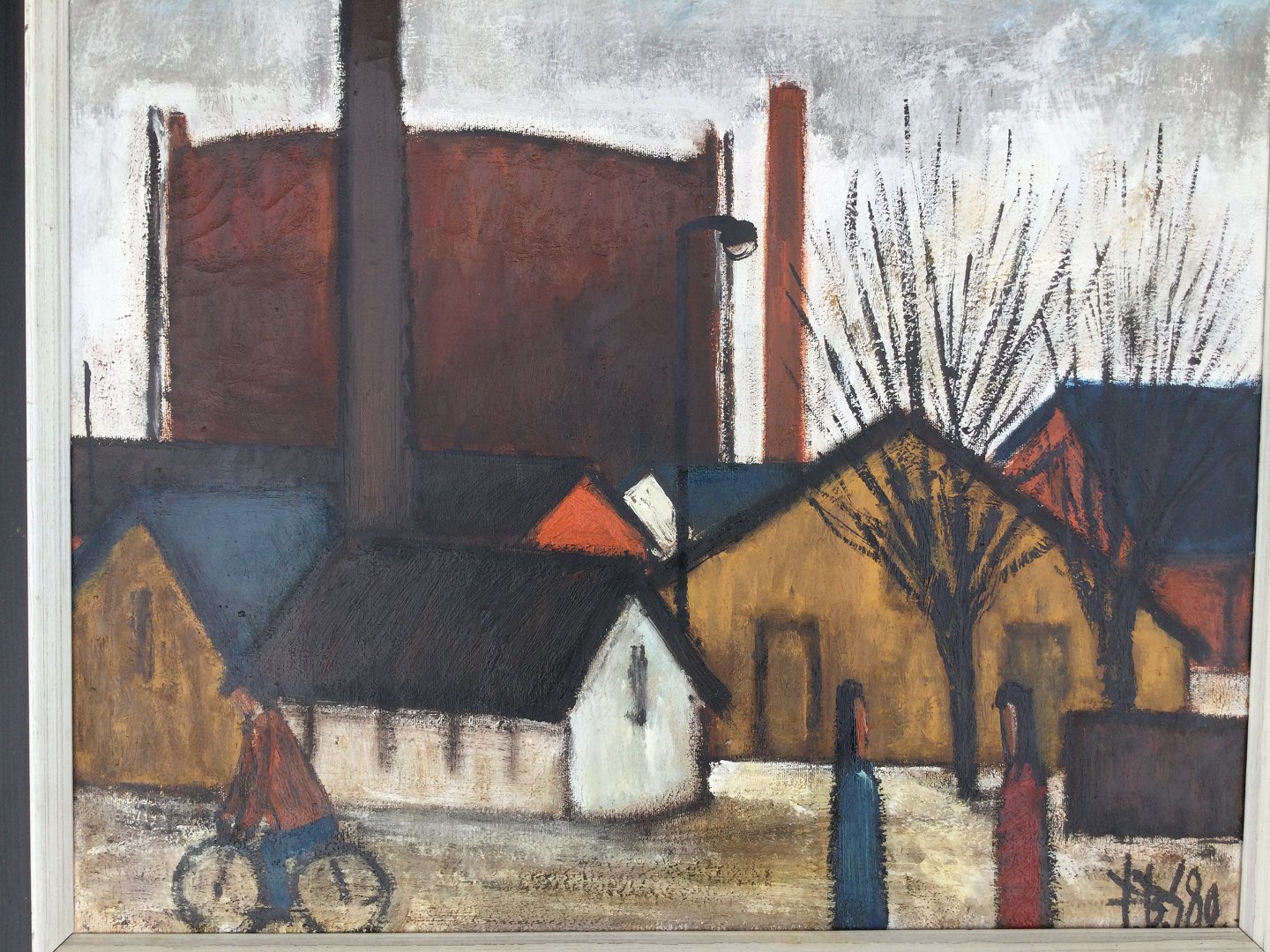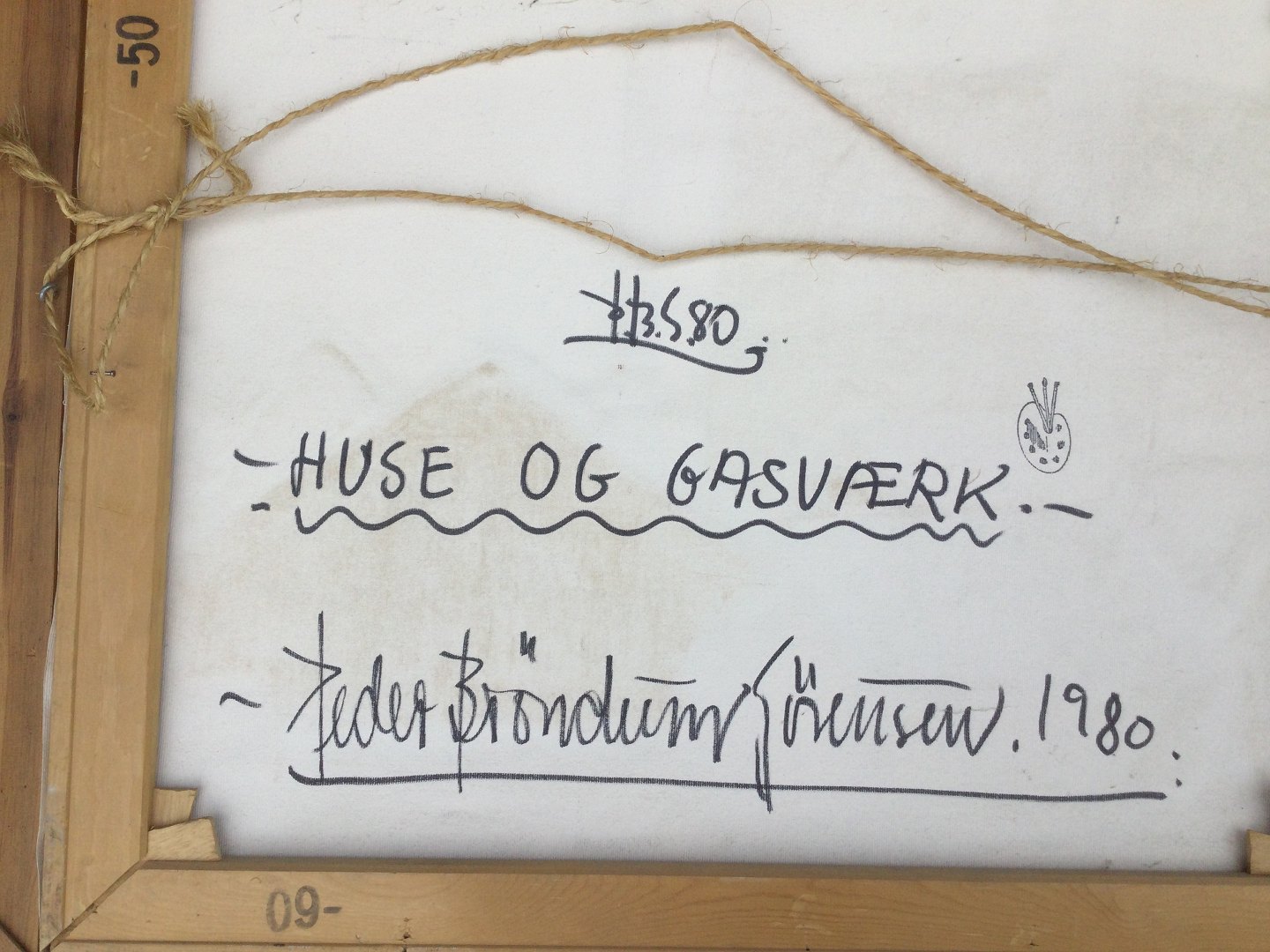 Maleri af Peder Brøndum Sørensen - Huse og Gasværk 1980.