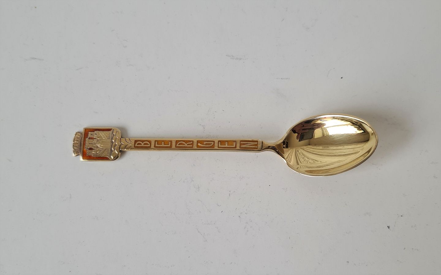 Norsk mokkaske i forgyldt sølv og emalje med teksten Bergen