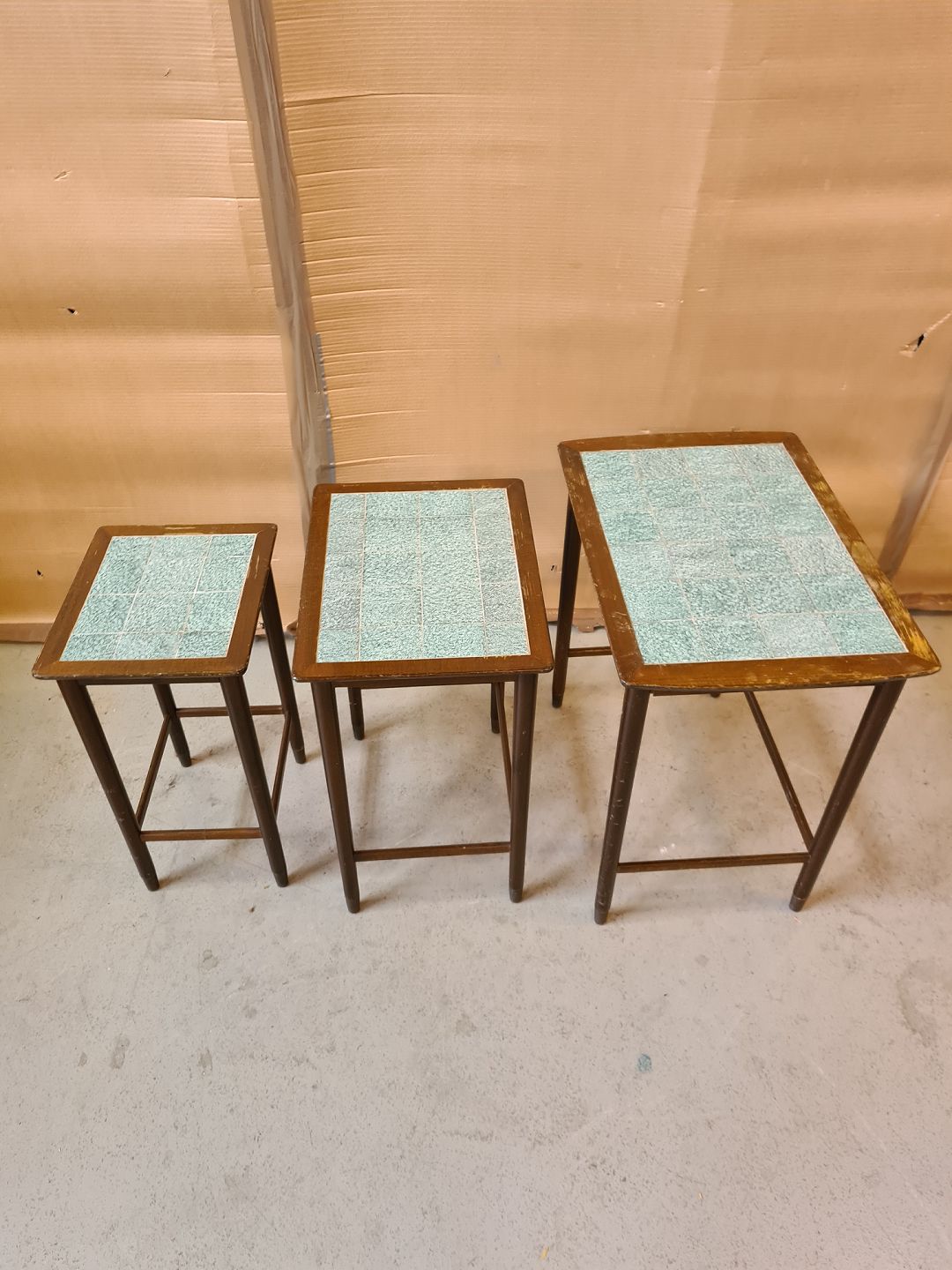 3 Indskudsborde i nødetræ med kakler, fra 1950erne.