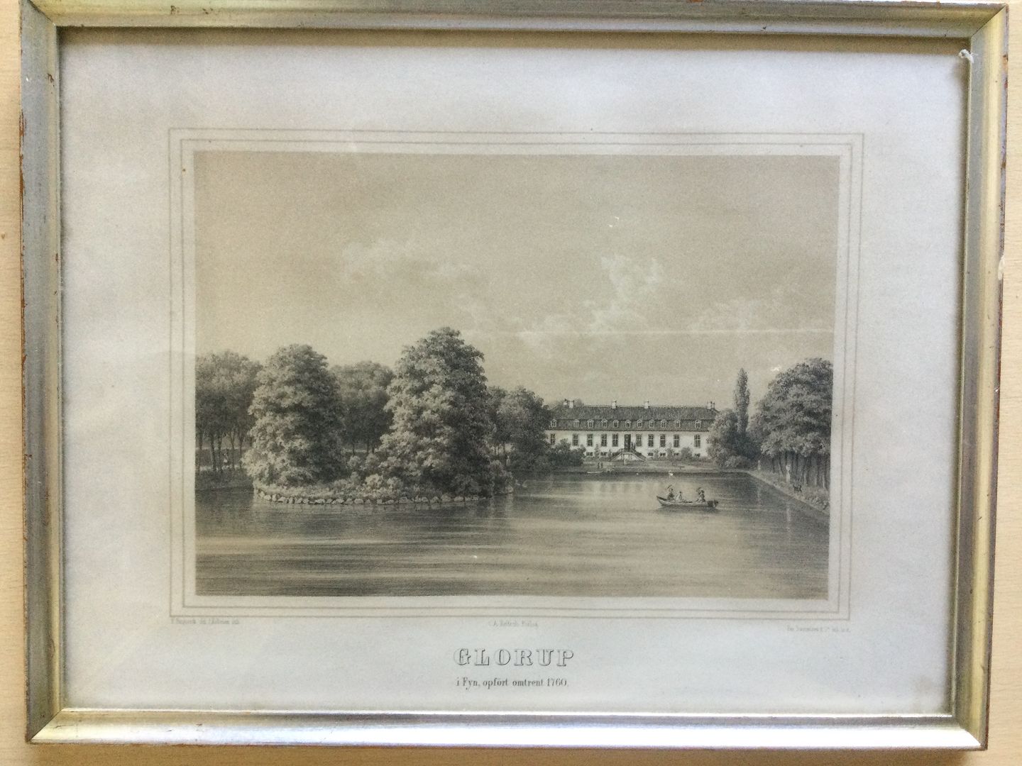 Litografi af Glorup Gods, Svindinge, Fyn ca. 1850.