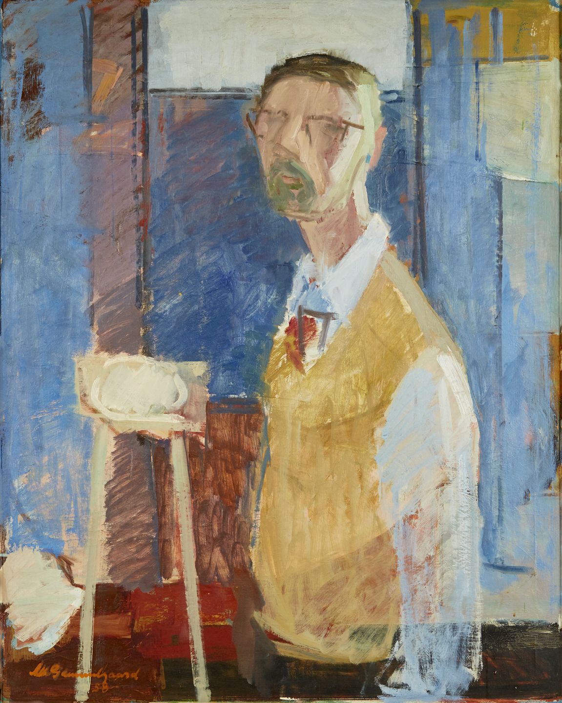 Selvportræt olie på lærred i orginal hvidmalet ramme.