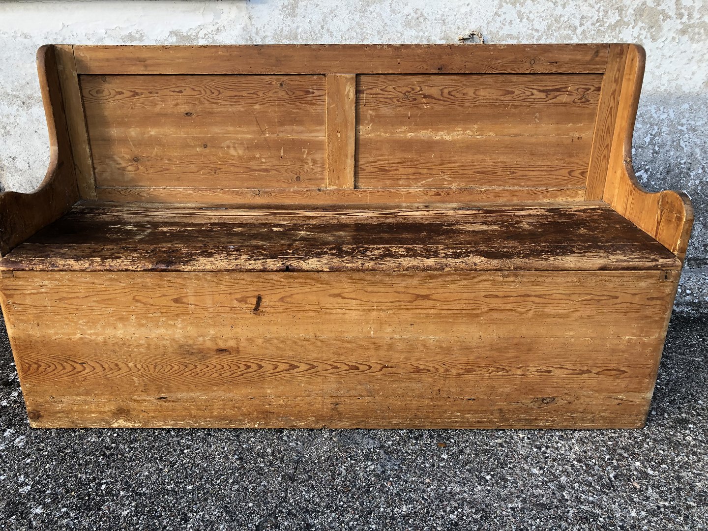 Ældre fint patineret slagbænk i fyrretræ. Fremstår med forstærkning / reparation under låget. Mål: 159x91x44 cm