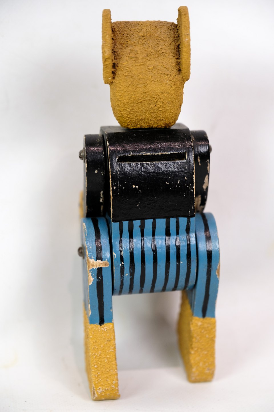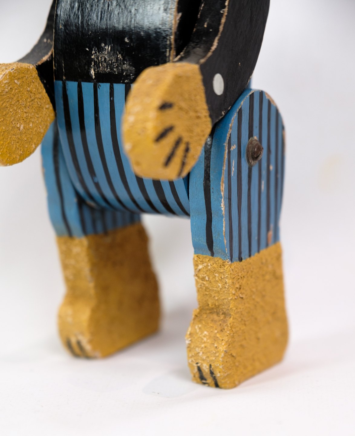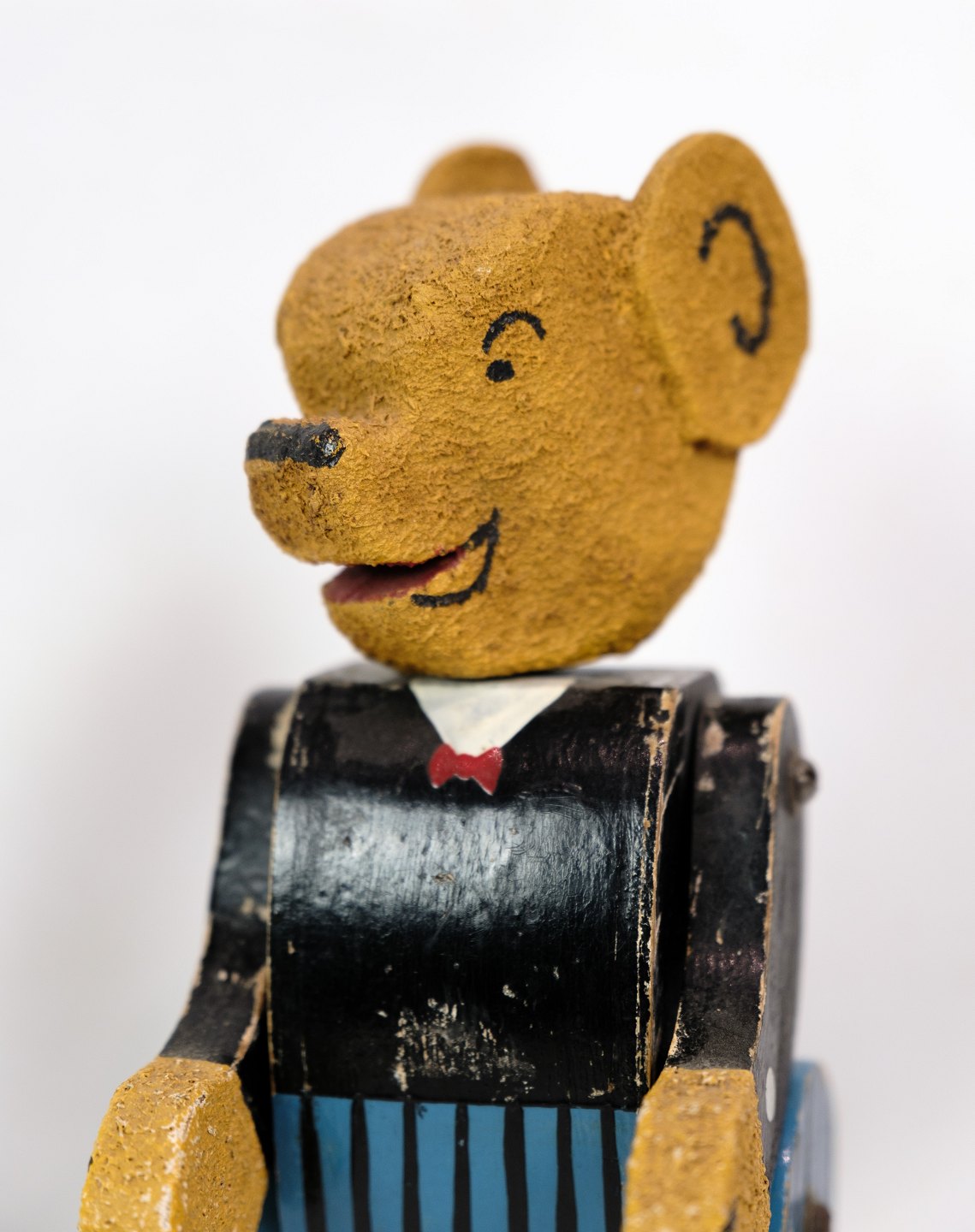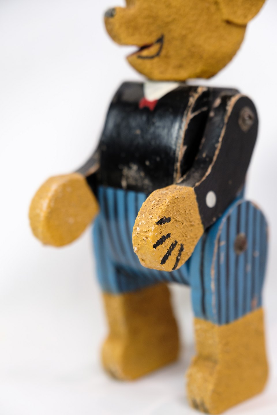 En legetøjs bamse lavet af træ som gennem årene har fået patina fremstillet ca. år 1950'erne.