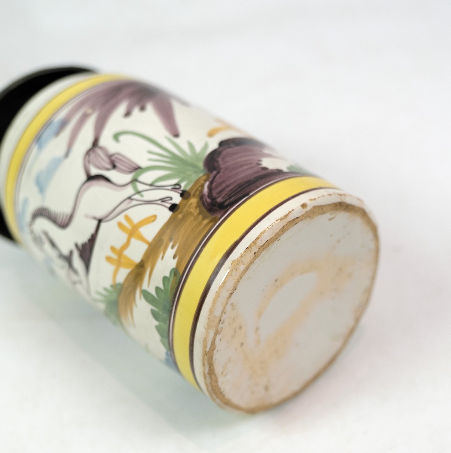 Tysk Kellinghusen lågkrus med motiv af blomster og hest med tin låg fra omkring år 1780'erne.