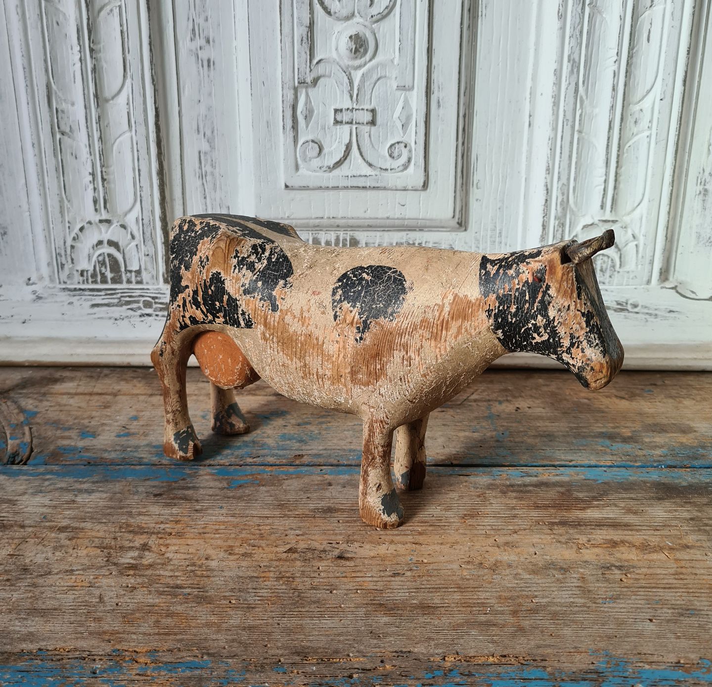 Gammelt trælegetøj i form af stor sortbroget træ ko.
