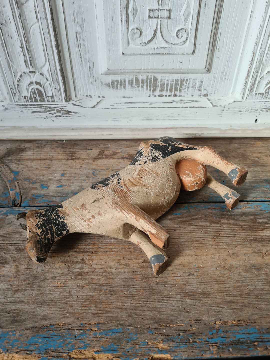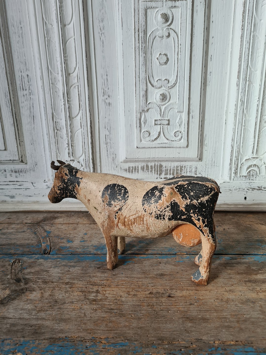 Gammelt trælegetøj i form af stor sortbroget træ ko