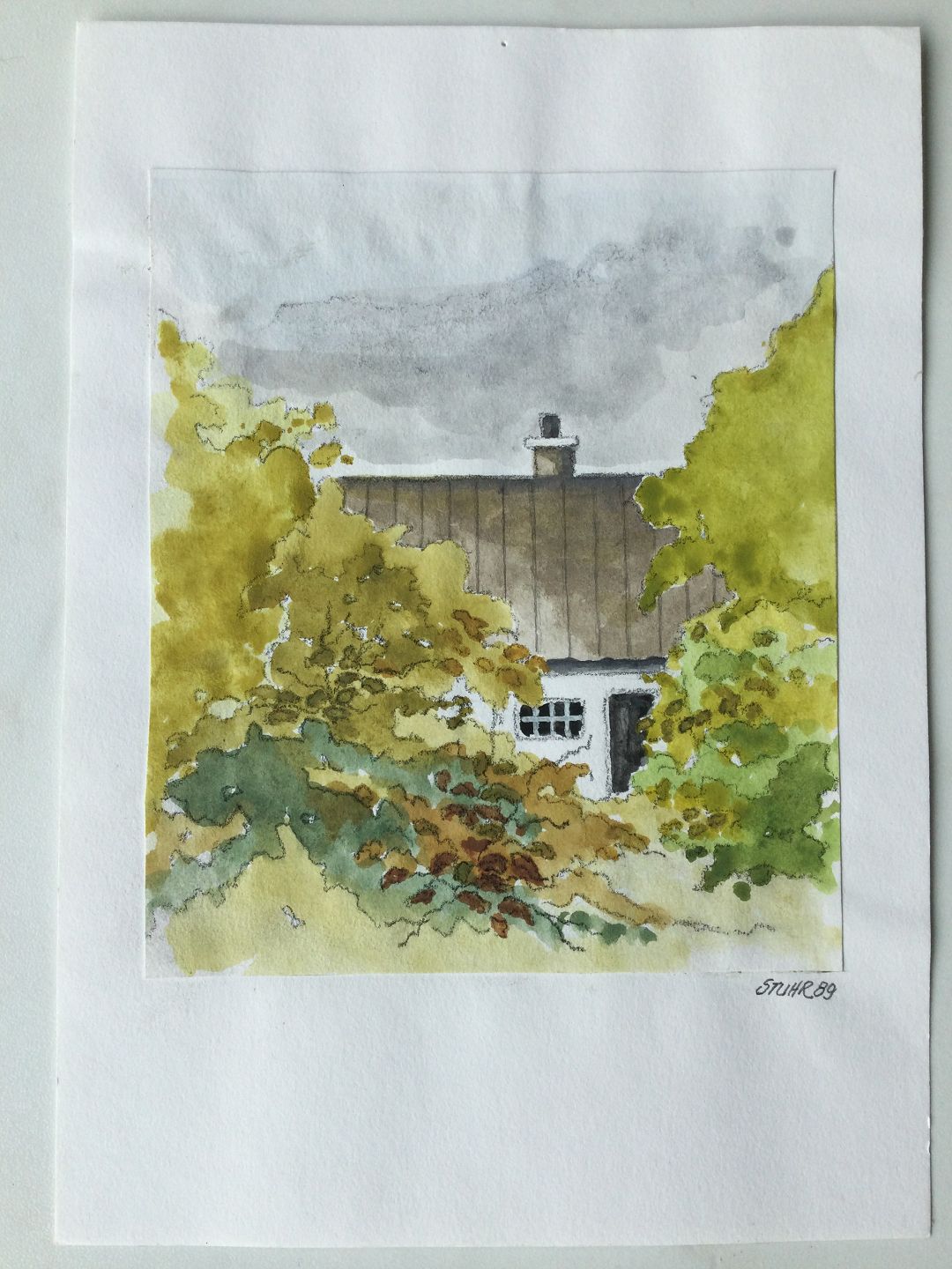 Akvarel af Erik Stuhr - Gårdlænge i have 1989.