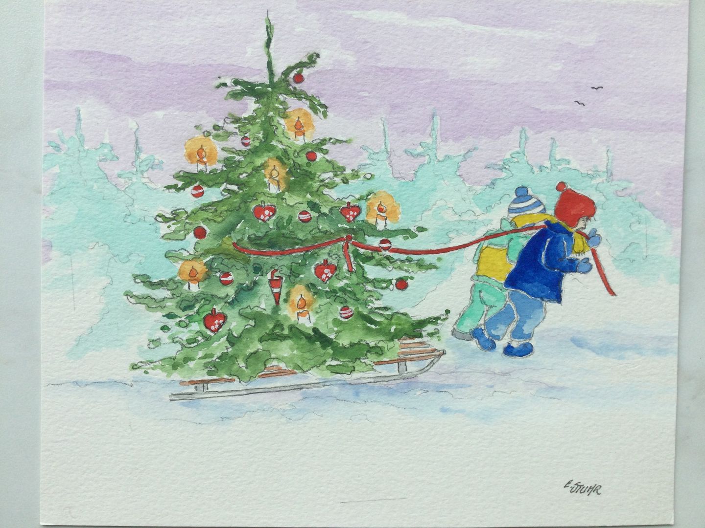 Akvarel af Erik Stuhr - 2 børn med juletræ på kælk.