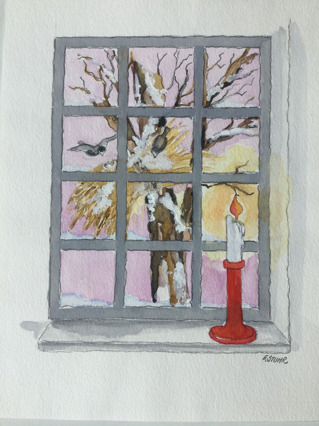 Akvarel af Erik Stuhr - Stearinlys i julevindue.