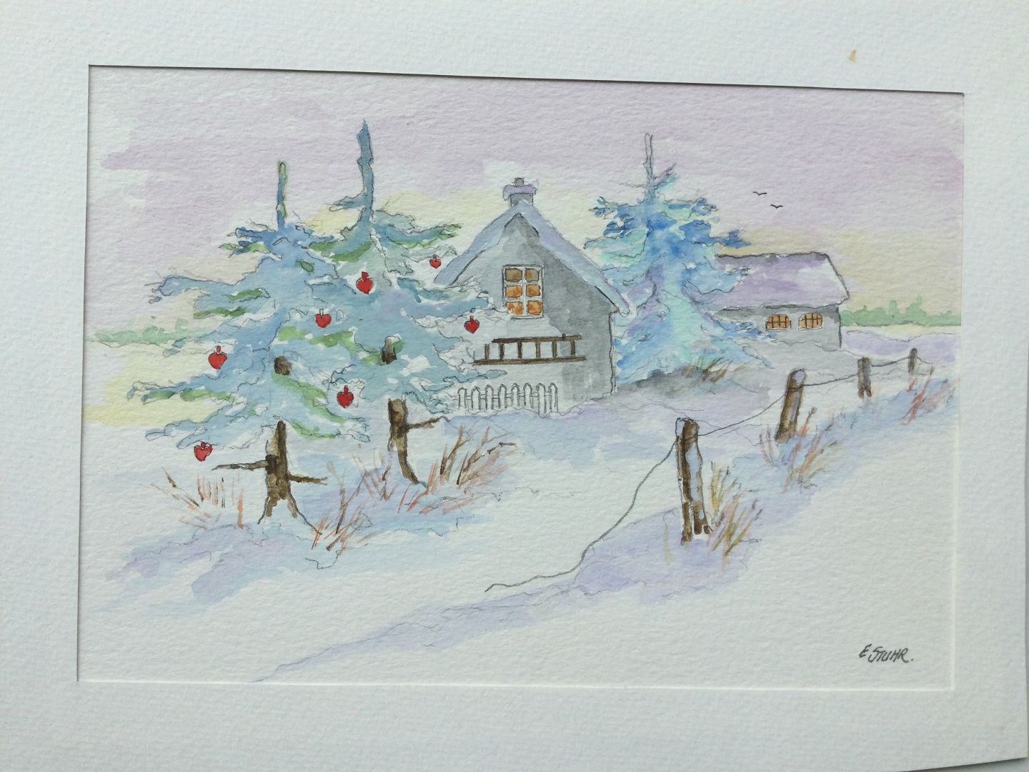Akvarel af Erik Stuhr - Snelandskab med gård og julepyntede træer.