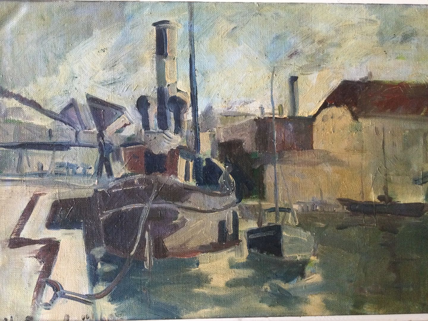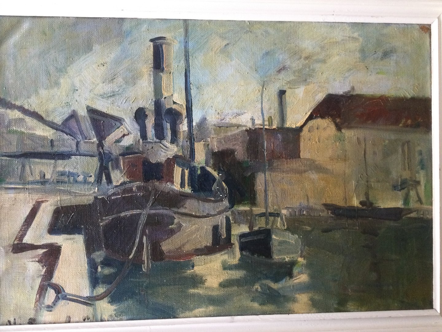 Maleri af Ole Sværdpiil - Havneparti 1948 - antagelig fra Aarhus.