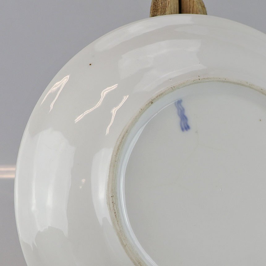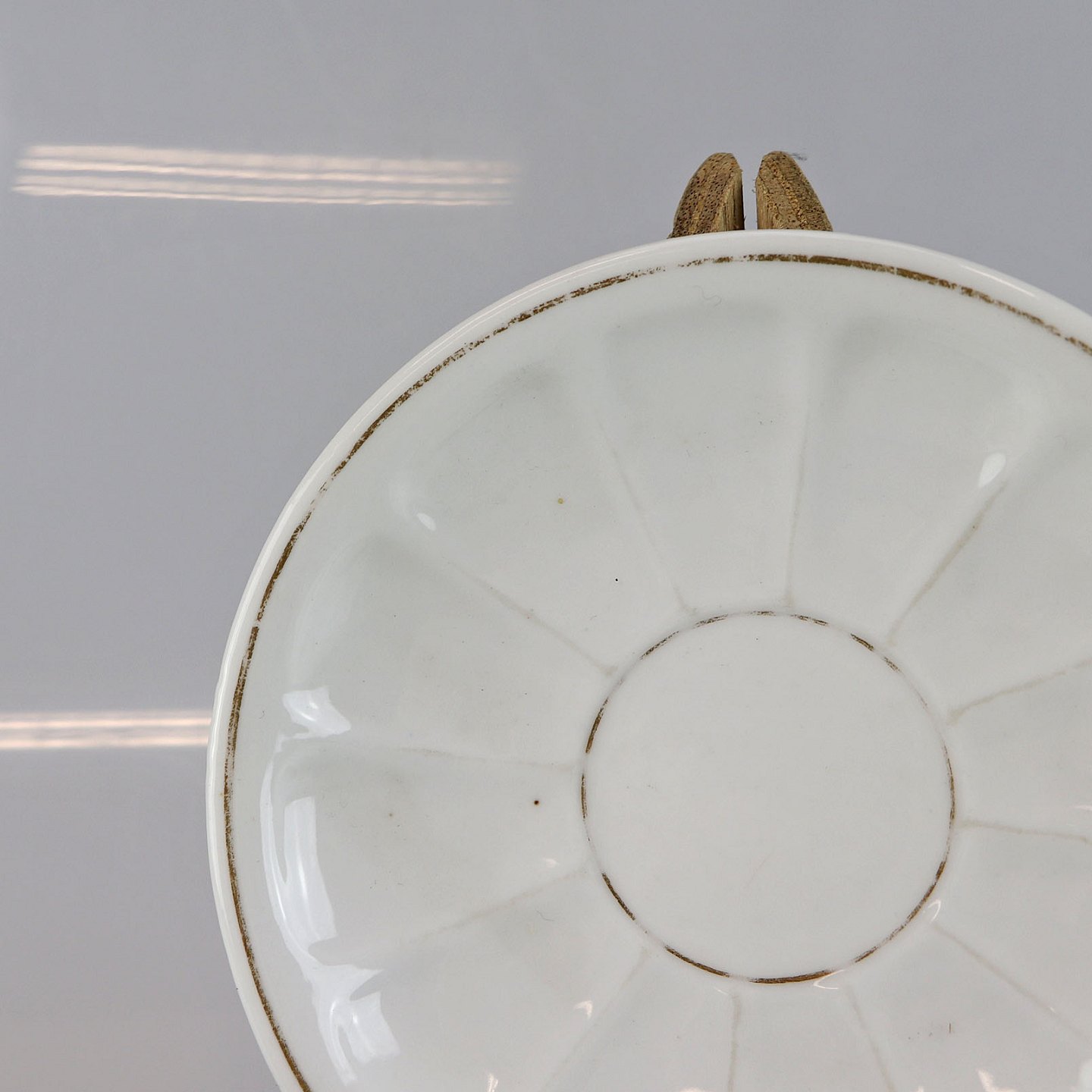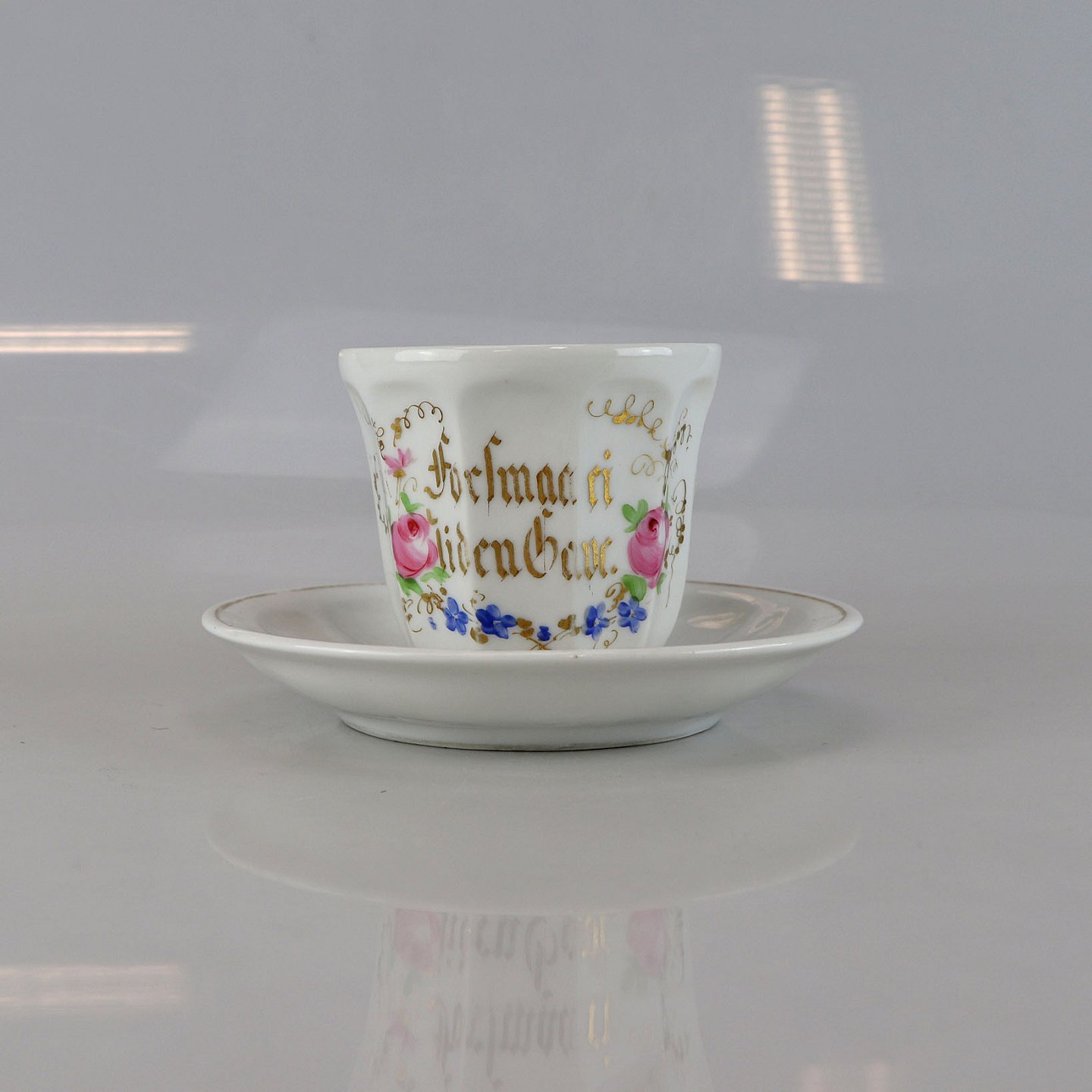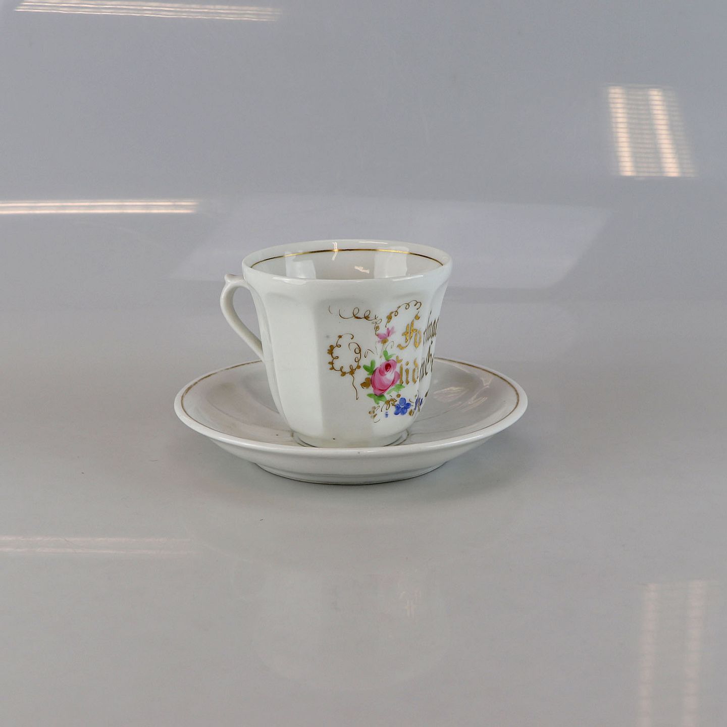 Gammel kaffekop med guldkant, skrift og blomstermotiv.