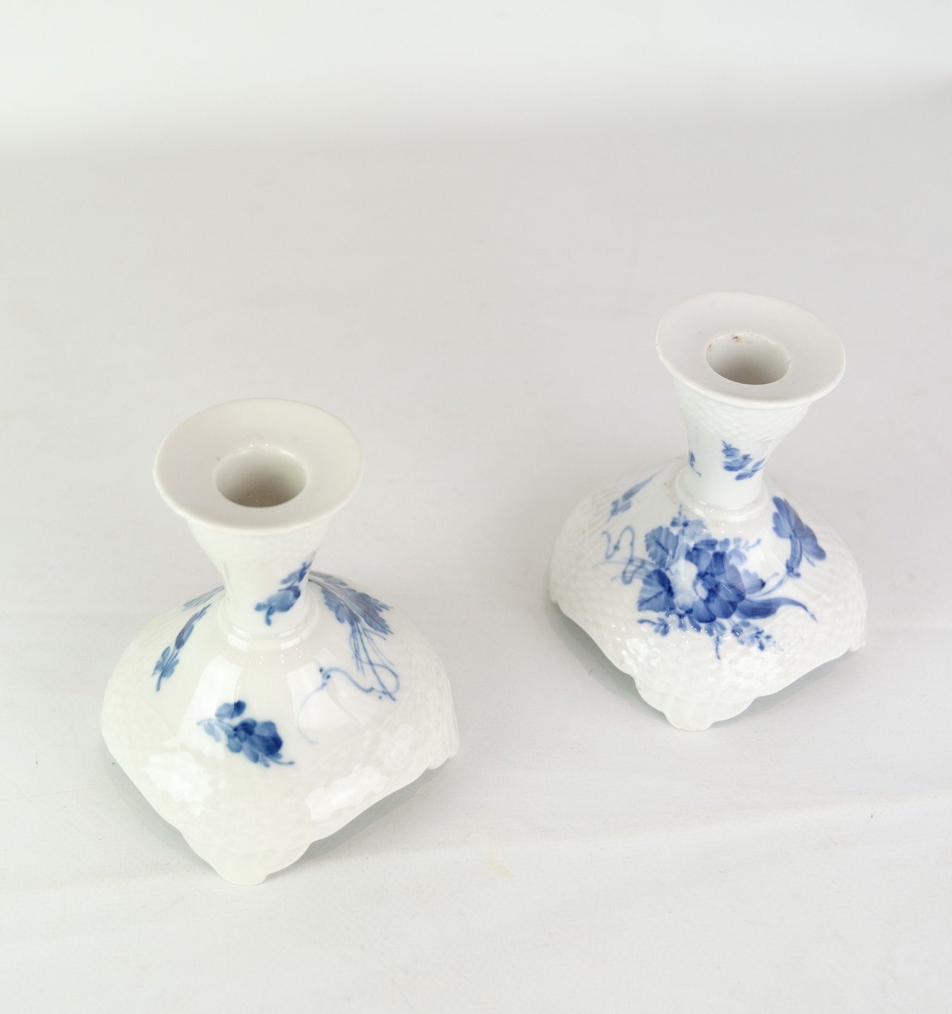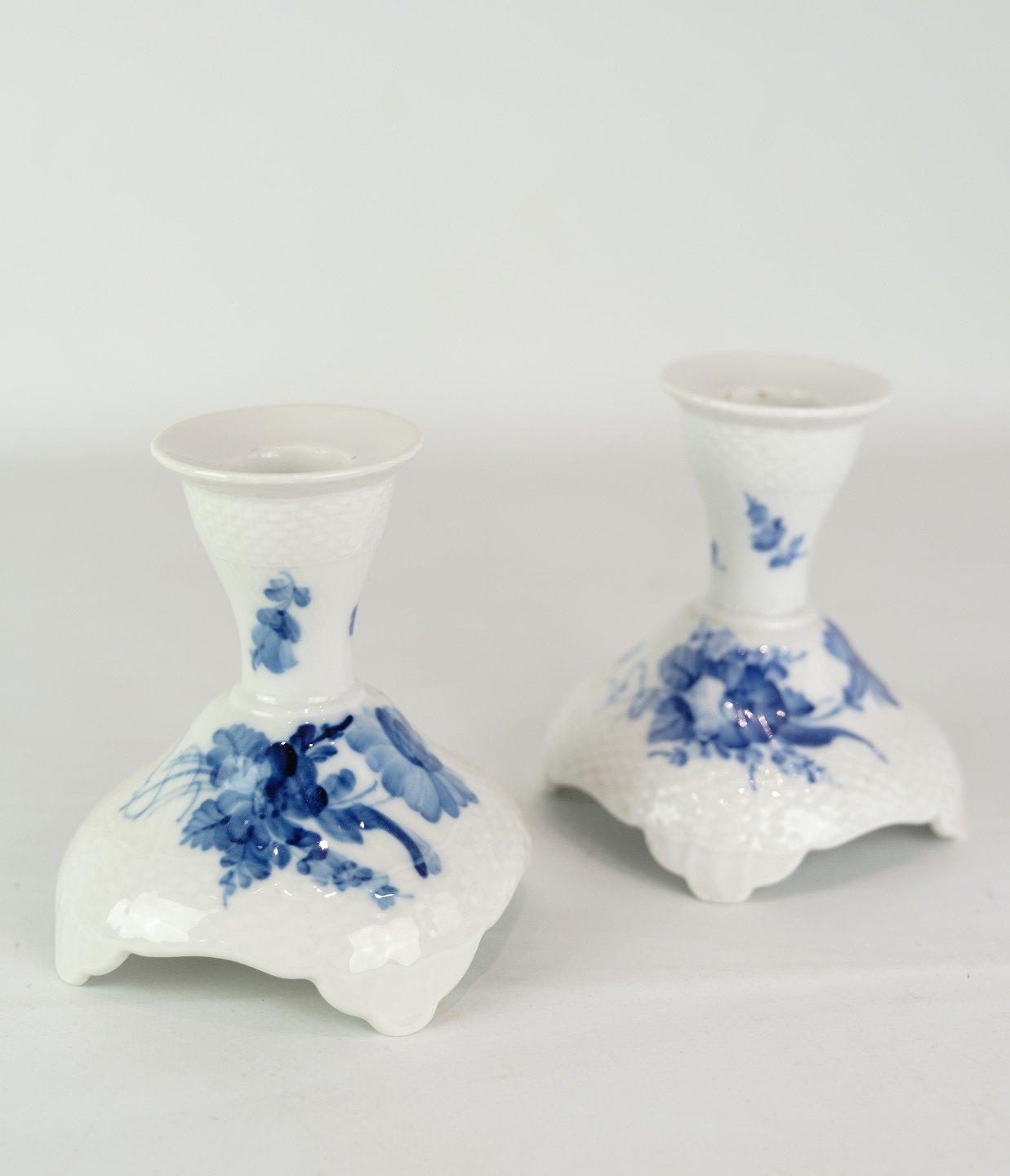 A pair of candlesticks in a patterned blue flower swooped by Royal Copenhagen no. 1711