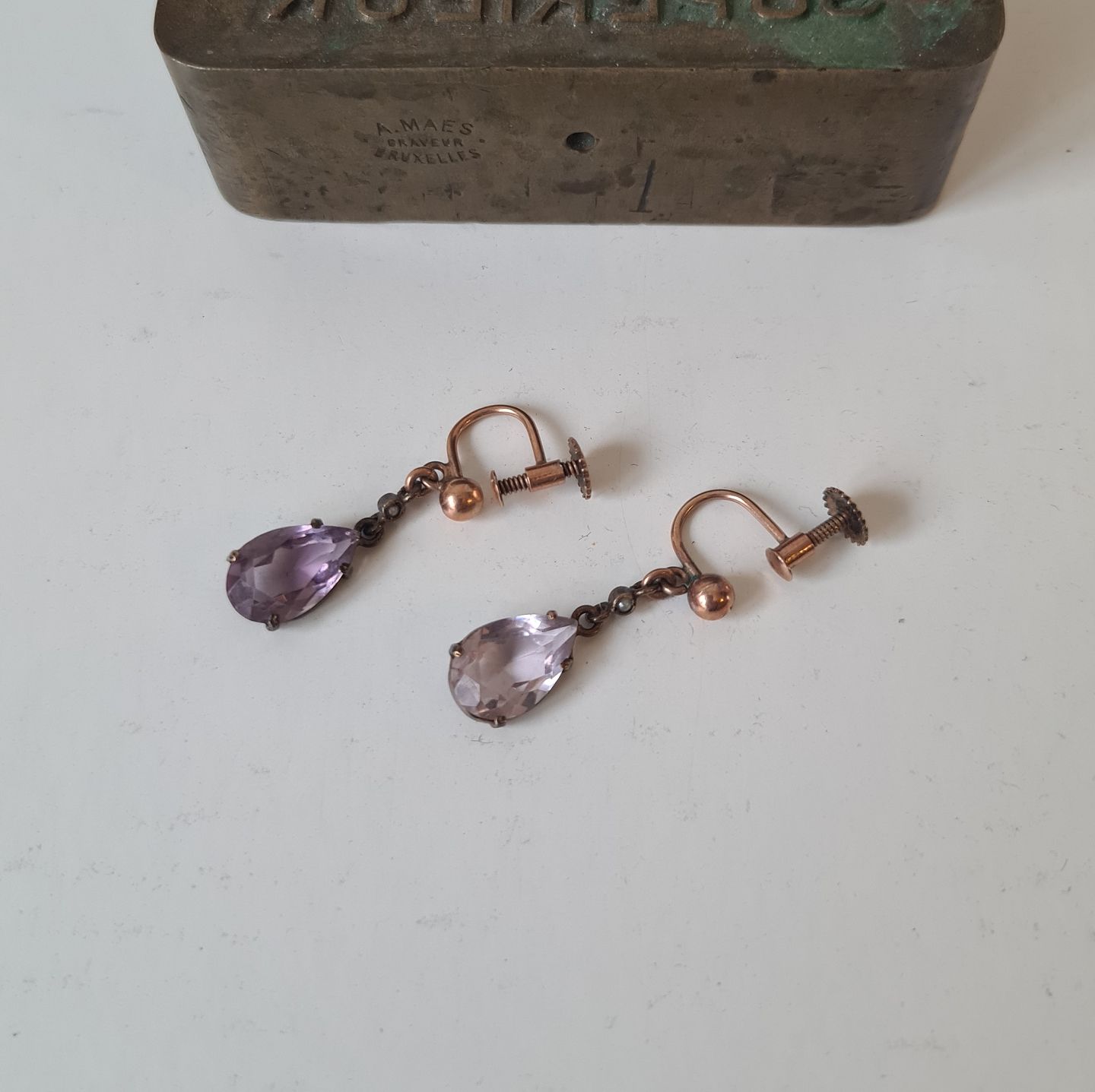 Smukke forgyldte øreringe med facetsleben dråbeformet lilla sten samt lille perle