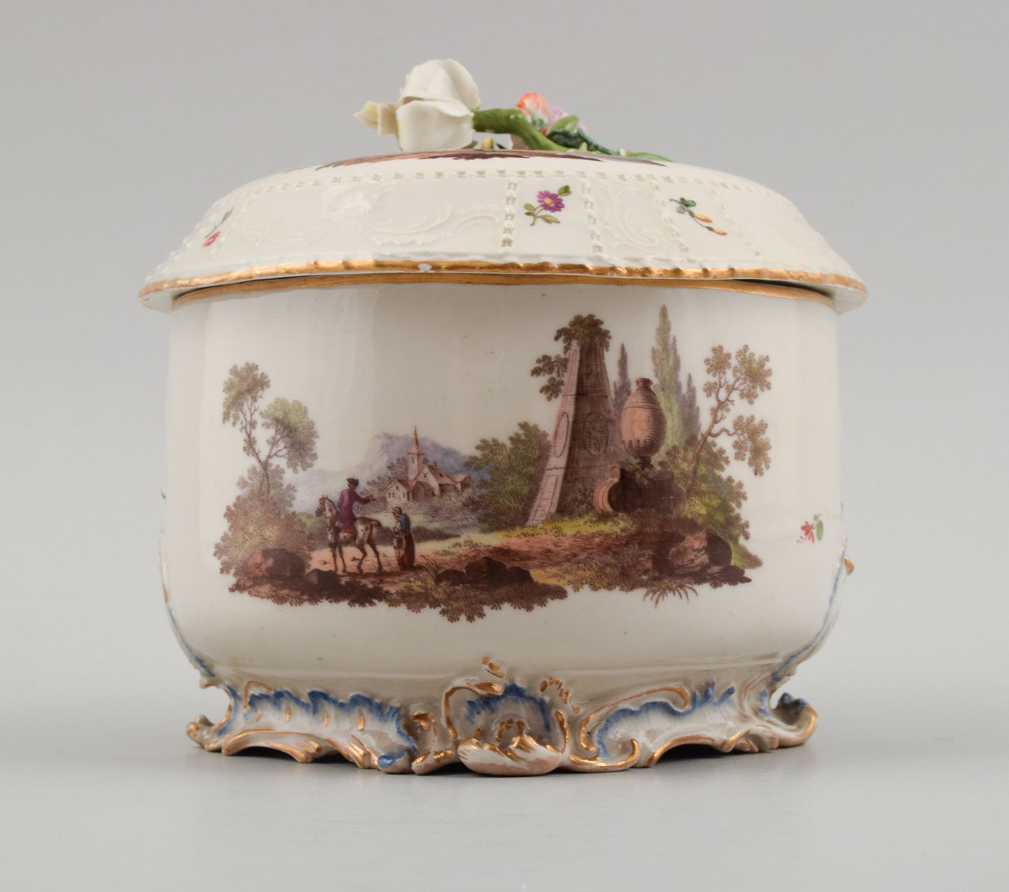 Louisbourg, Tyskland. 1700 tals stor sukkerskål, håndmalet med landskabsscenerier, låg med blomster i relief.