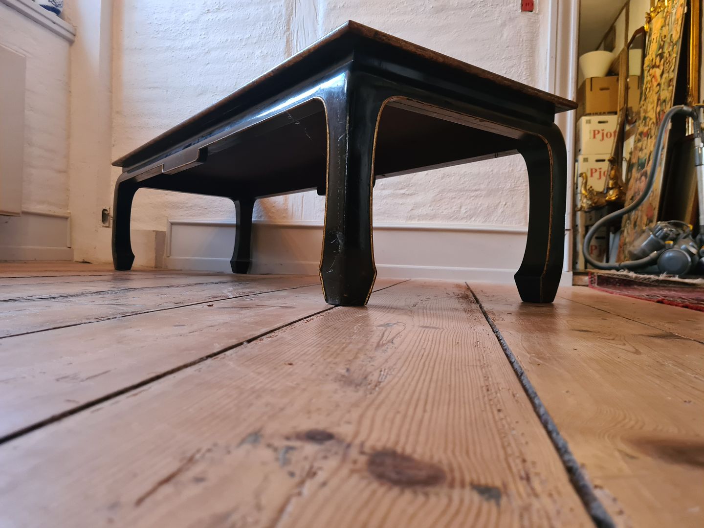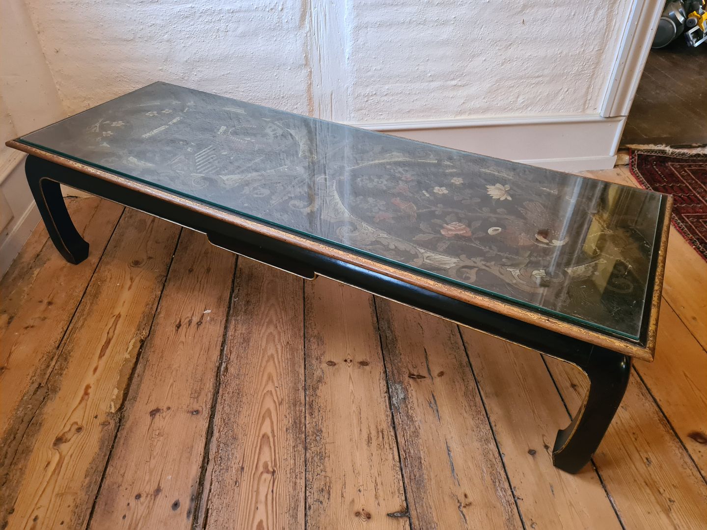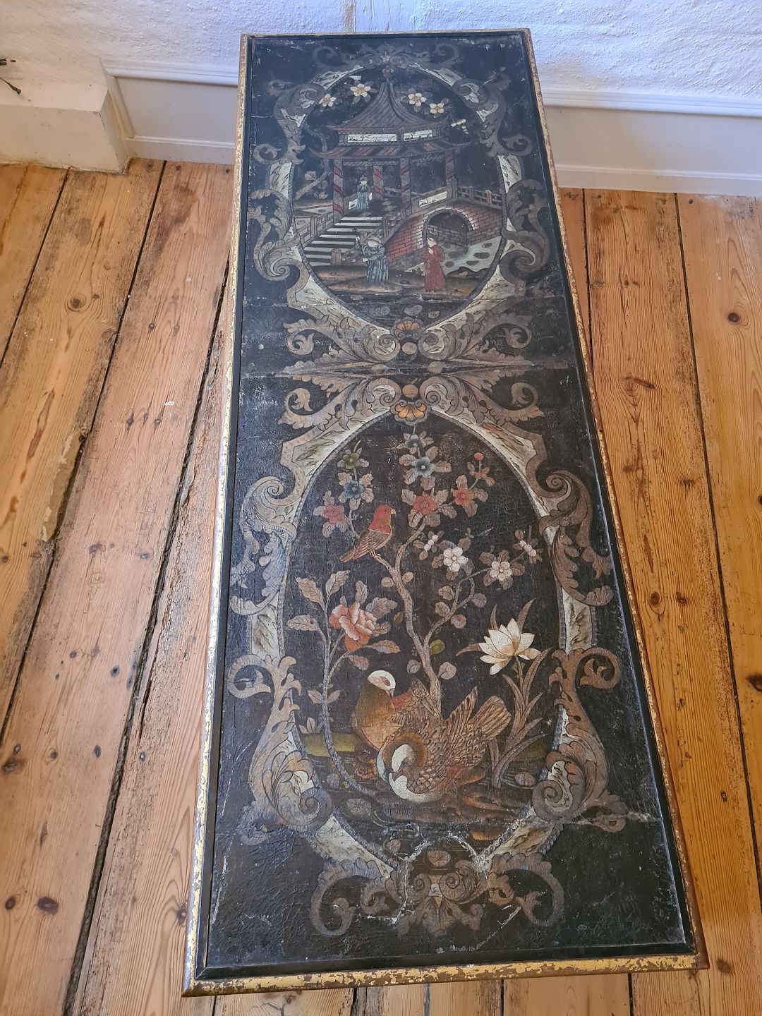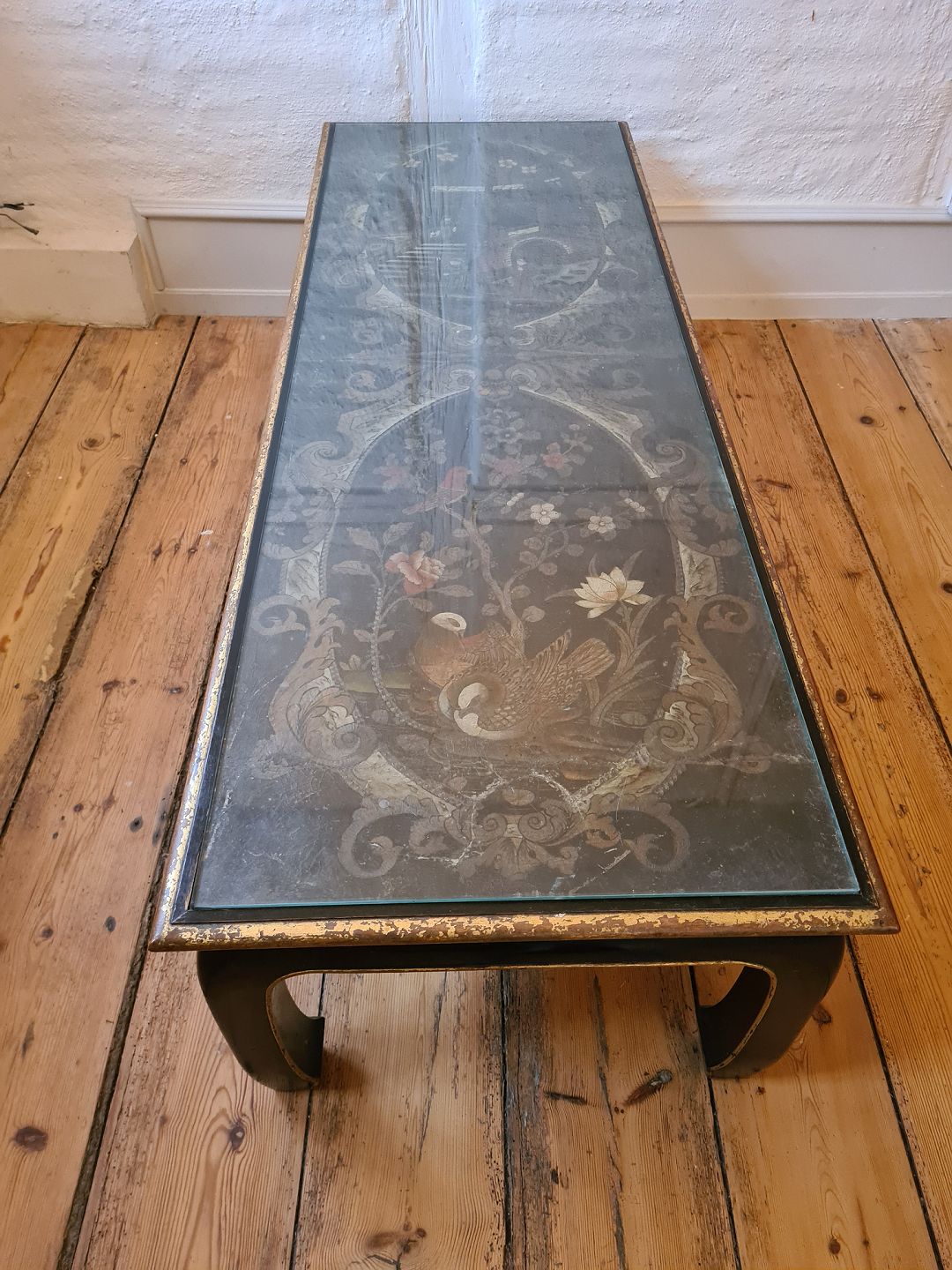 Orientalsk sofabord med glasplade, bestående af håndmalet panel fra 1700 tallet på nyere bordstel fra 1920´erne. Fremstår virkelig flot og velholdt.