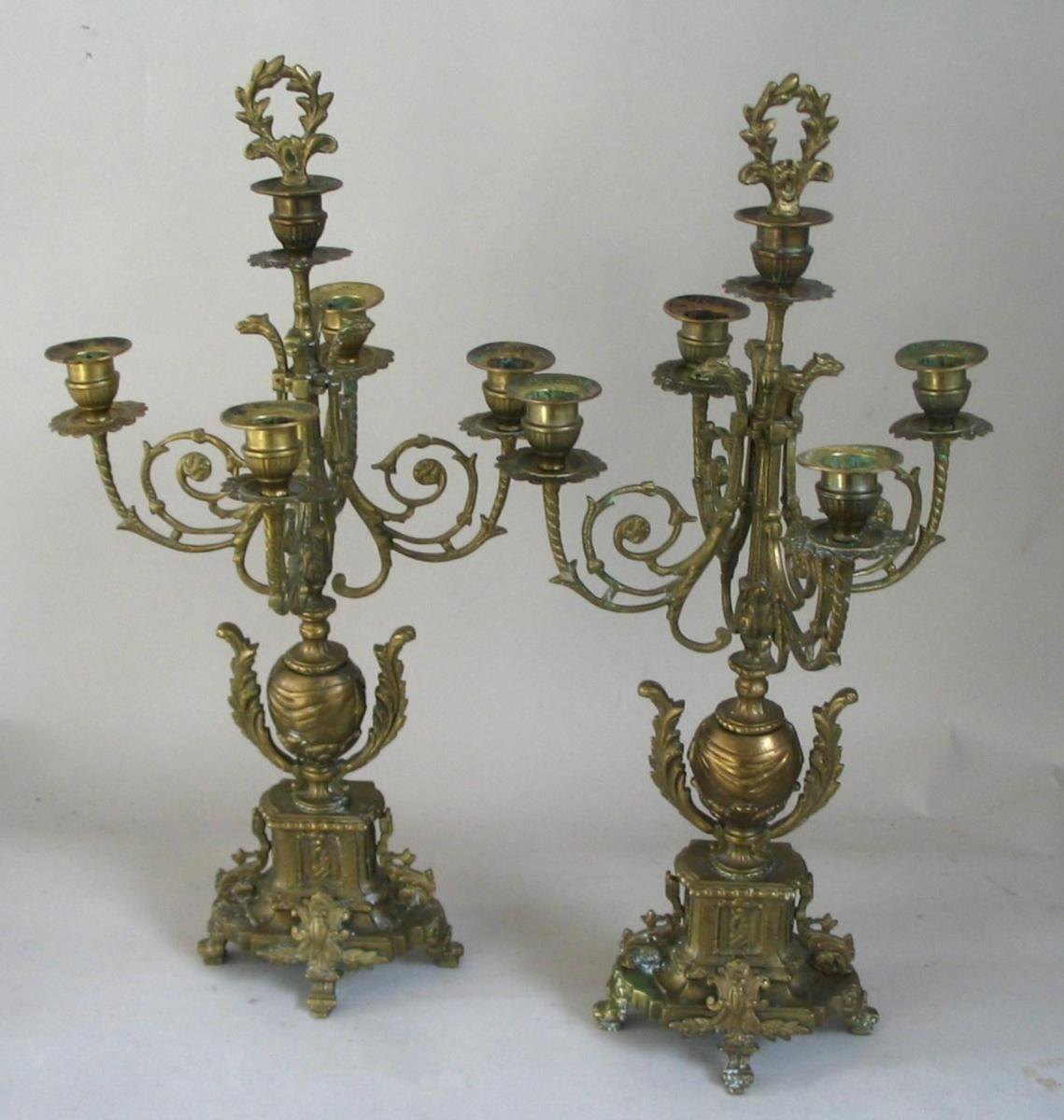 Par 5-armede kandelabre i messing/bronze, Frankrig ca.1880. På fod med dekorationer; lysarme med dyrehoveder. H.: 51 cm.