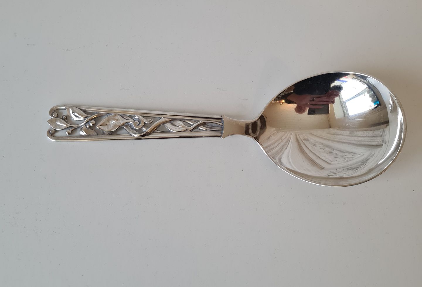 Large beautiful serving spoon in silver with ornamental decoration from Horsens Silver 1958